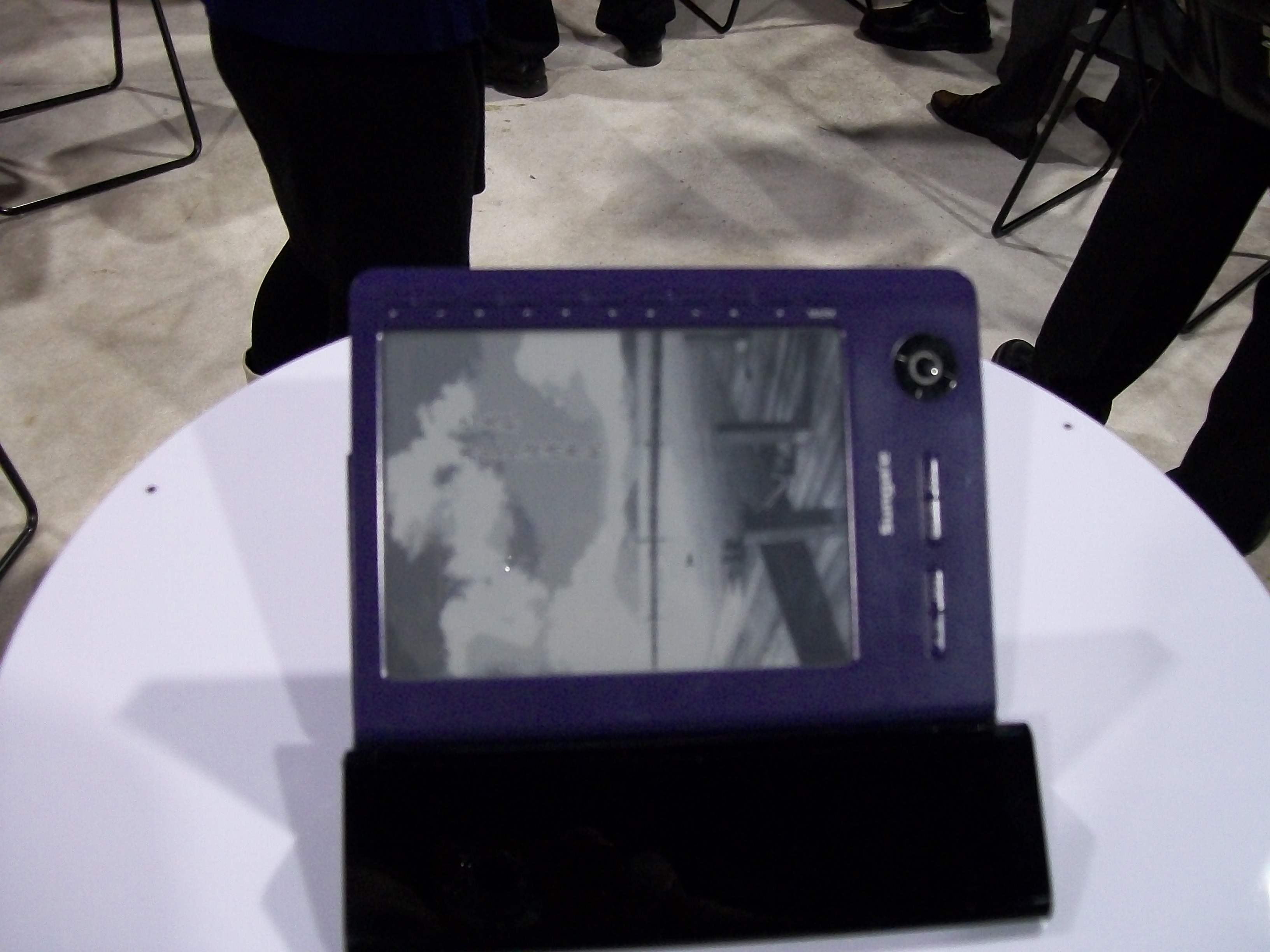 Sungale is a maker of small electronic devices like digital picture frames, IP radios, and the like. The EB601 is a departure from the rest of Sungale's products in that it is the first to use an epaper screen. There were a couple mock-ups and 1 functional unit on hand. The one functional unit had an incomplete and still buggy firmware, so I couldn't actually read anything on it. The projected release date is April with a retail of $169.
