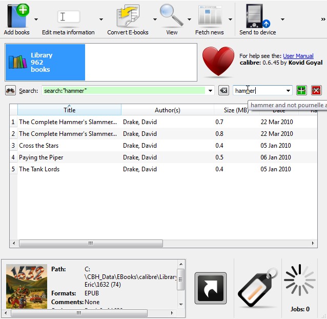 1. Just after calibre starts. This is what you see when the application starts. There is a new combo box and two new buttons on the right side of the search box. (attachment 1-after_opening.jpg)