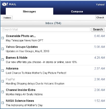 2. Yahoo mobile mail: softrooted browser display more email entries per page with long mail preview content (see attached page layout); Nook browser displays a very short form with fewer mail entries and very short mail preview content.