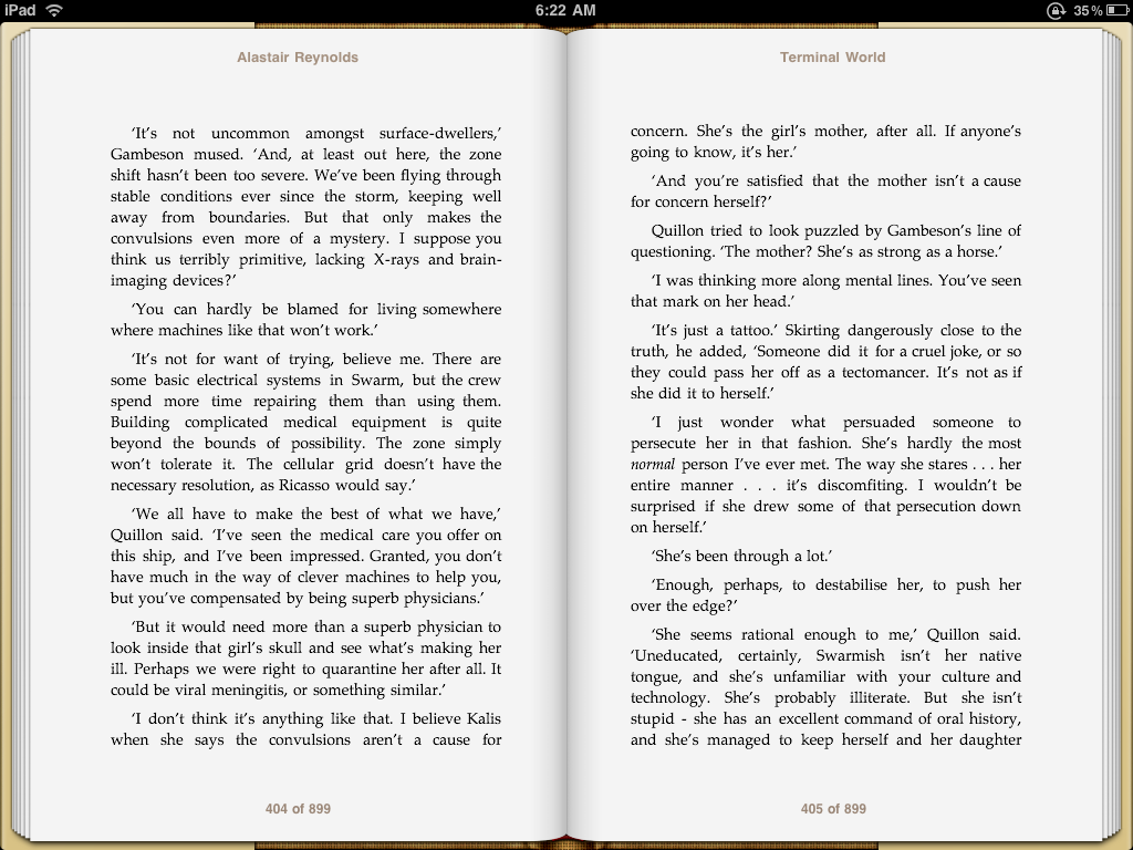 The iPad I'm finding is also an excellent reading platform. I don't feel any distraction while reading on it. There is no popups, other apps running, icons for other apps tempting me to run them. Here is snapshot of what iBooks looks like for me. I don't have to smell my book to get into it but I do have to have a nicely sized text page without colourful bells and whistles around it.