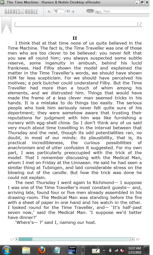 For my tastes, the eReader interface is much more intuitive and easier to use, and it takes up more of the screen in Fullscreen mode than does the B&N Reader. It also seems a bit faster than the B&N Reader. However, eReader only displays .pdb and .prc eBook formats while the B&N Reader displays .pdb and .prc and ePub formats. I would definately choose FBReader over the B&N Reader for ePub though. Note: The screenshots are rendered poorly by the forum software. In reality they are both clear and crisp with the text. The screen resolution on the Asus T91MT is 1024 x 600. [EDIT] I found this section in the Barnes & Noble Desktop eReader User Guide: RETIRED FEATURES As part of 2.0, we retired some features. These may resurface in the future or we may have new features – stay tuned!