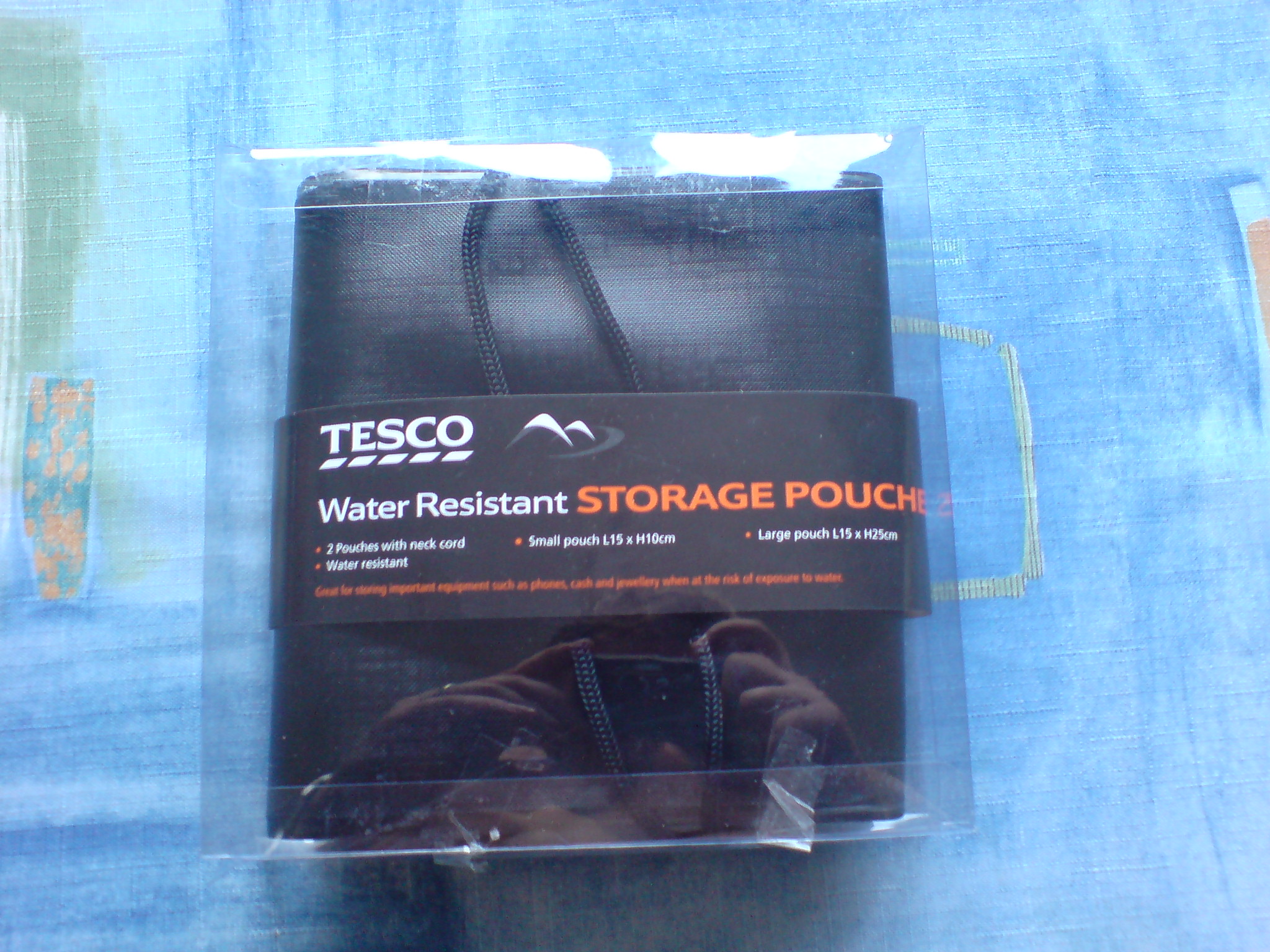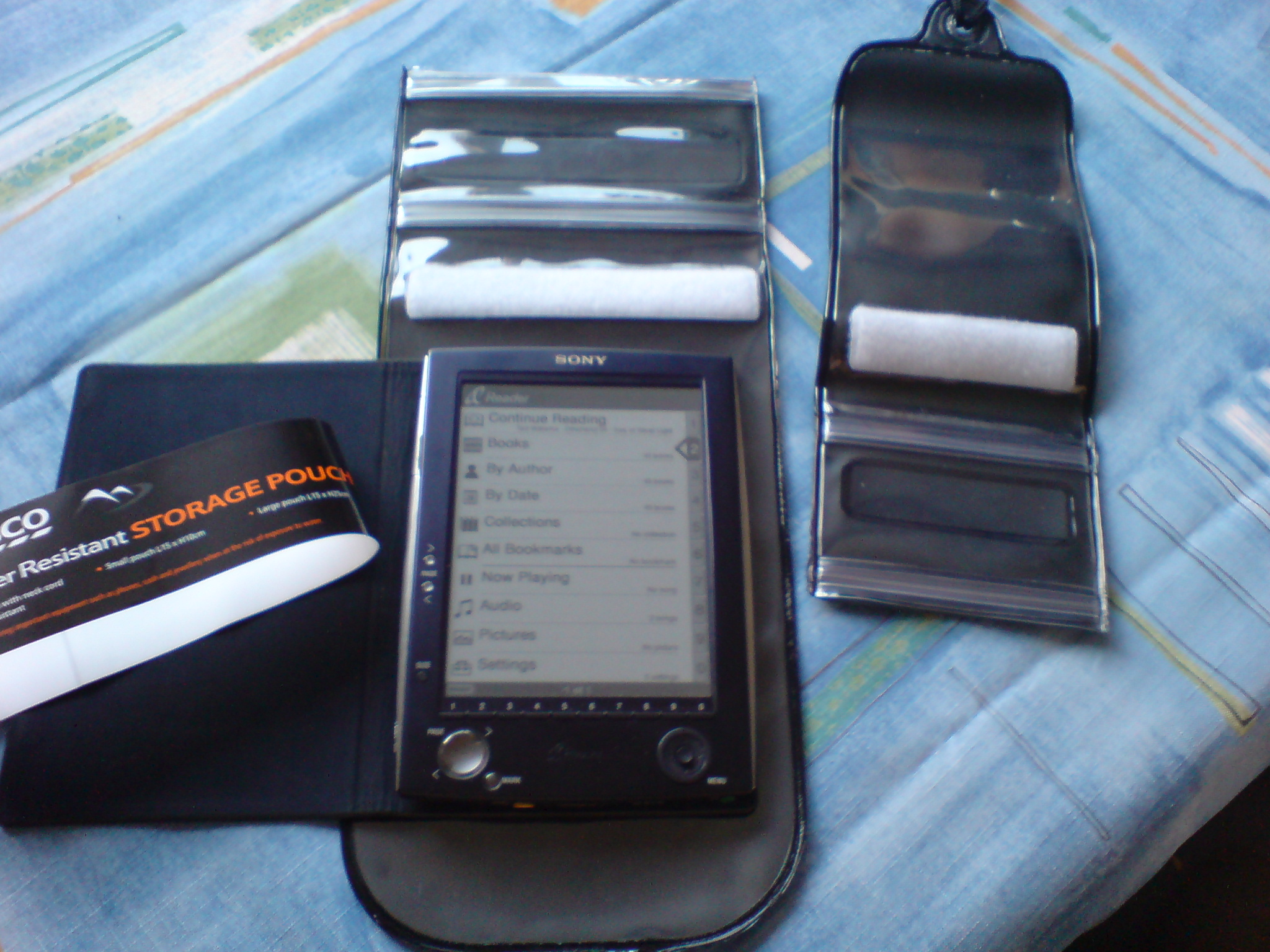 I went shopping to the local Tesco supermarket and look what I found. For $4 you get two pouches. One for a mobile phone (10x15cm) and another for Reader (15x25cm). Just the perfect fit for the Reader with the standard cover atached. I can even switch the Reader on while it is in the pouch. It is much, much sturdier and more "waterproof" than an ordinary ziplock bag. It has two zippers ala ziplock and the opening end folds several times. The fold is held in place by a welcro strip. I would not take my reader for a swim in this bag, but as a protection from sand and dripping family members and/or pets it is great. |