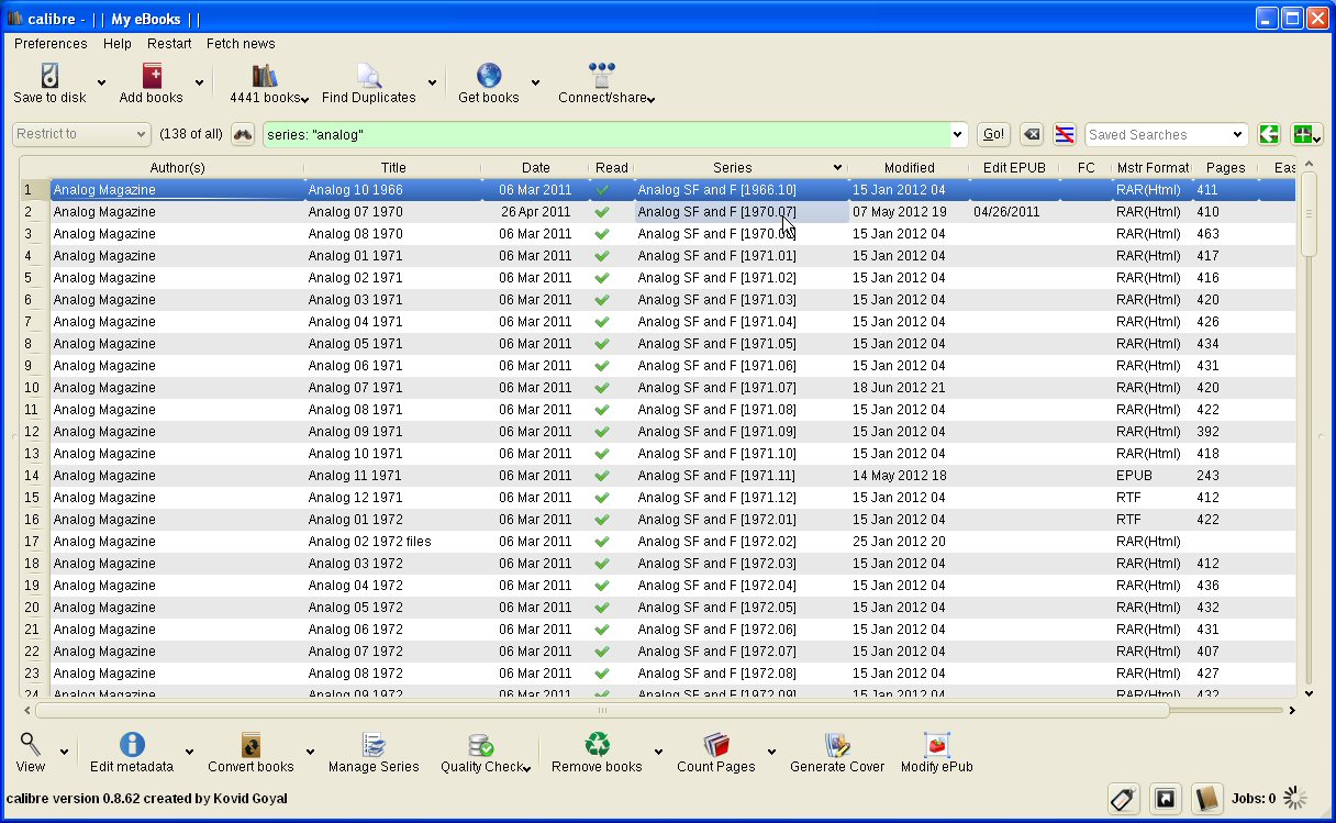 Thank for pointing out the duplicate issue I will rename my files to get around that. e.g. Analog Science Fiction and Fact September 2010, 2010-09.mobi Last edited by donnelyn; 08-24-2011 at 11:36 AM. |