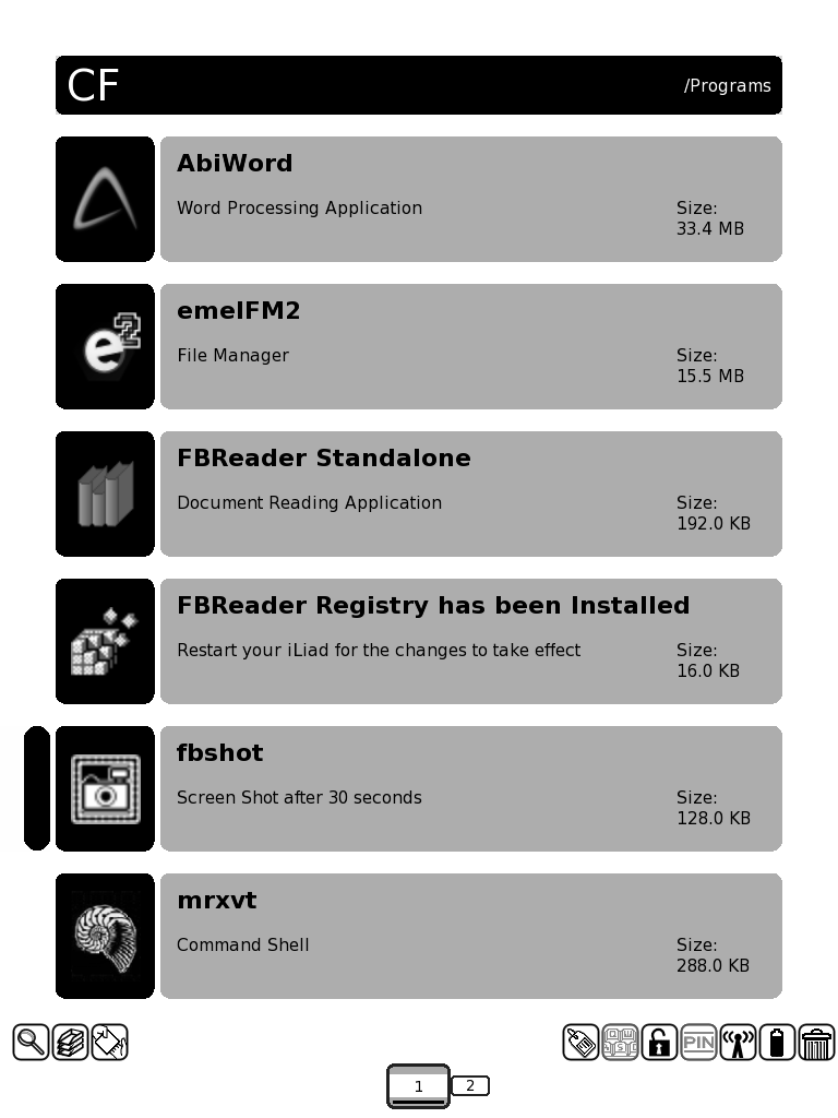 Unzip the attached file and copy the fbshot directory into (say) the Programs directory on your CF card. Select fbshot from the contentlister to take a screenshot. A bit more than 30 seconds later, it will be in Programs/fbshot/shot with the current date and time in the filename. I have only tested this on a CF card, but it should work anywhere you normally put contentlister based programs. For debugging, the stdout/stderr of the last invocation of the fbshot command is in Programs/fbshot/fbshot.log. If a 30 second delay is too short, change "-s 30" in run.sh. The easiest way to access these files is probably via usb connection to a desktop, although mrxvt and emelfm2 can also access them. I enclose two screenshots (contentlister in Programs directory, and FBReader). These do not do justice to what is on the iLiad screen (particularly for text), but this has always been a problem with fbshot. EDIT: the screenshots are ok, but even when opening the thumbnails on a large screen the image may be rescaled by your web browser. Click on them again to get the full size and full quality image. Last edited by wallcraft; 10-17-2007 at 02:49 AM. |