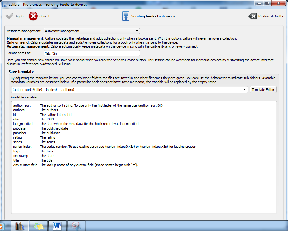 @dwanthny The settings you gave me offcourse worked as it should. It sorted the series from the calibre library as collection on my e-reader. In practice it would be better (in my case) if the authors from the calibre library would be created as collection on my e-reader. So I changed the input that “dwanthny” suggested until I found the setting I needed. In the end I found two think; 1# the corrected settings to create what I needed and 2# Why I could not solve it before. Namely I was to fixated on the differences between library thereby I could not see the one letter missing. Although it worked on the previous (old) laptop the corrected input is “Authors” instead “Author”. In the attachment you will find all settings that I used. Again Thanks and if you any suggestions I would be very interested. Last edited by Phyxius; 08-05-2012 at 07:32 PM. |