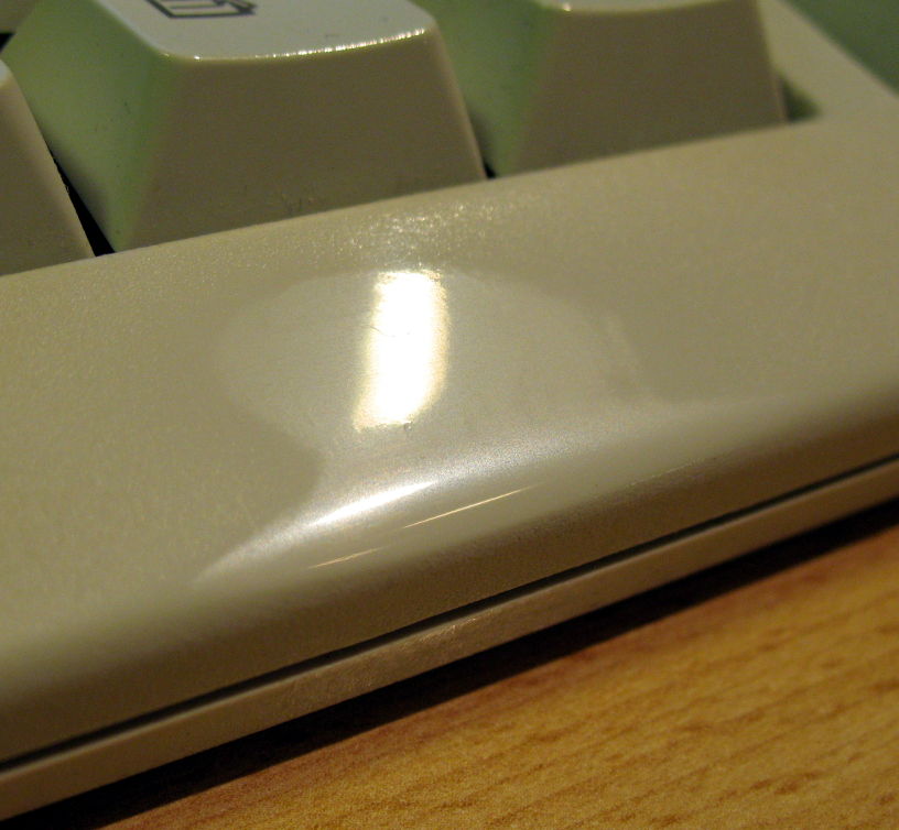 It starts looking like this after a year or so; not sure if you can see it, but the plastic is supposed to have a very rough surface - but it goes perfectly smooth on the right side where my hand is working as I type... it's bad keyboard habits really.
