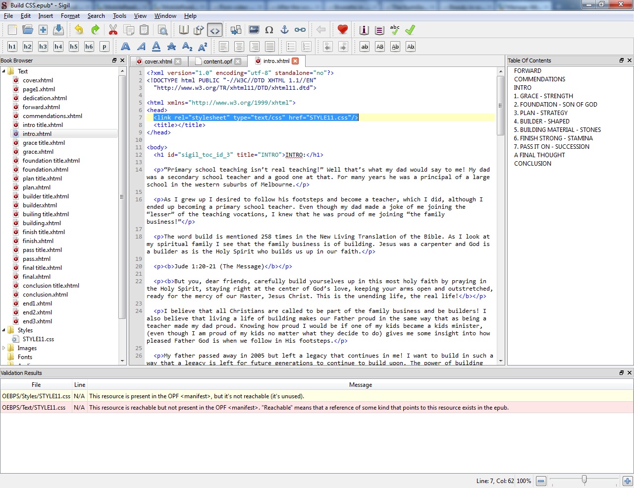 I formatting an an EBOOK. I want to add CSS file. I have created one in sigil. But when i compile it it gives me warning. I have attached a picture of it. I think i have to add css in every xhtml file. I have tried it but it is still not working. Picture is attached. Please help and correct me where i am wrong. Regards. |