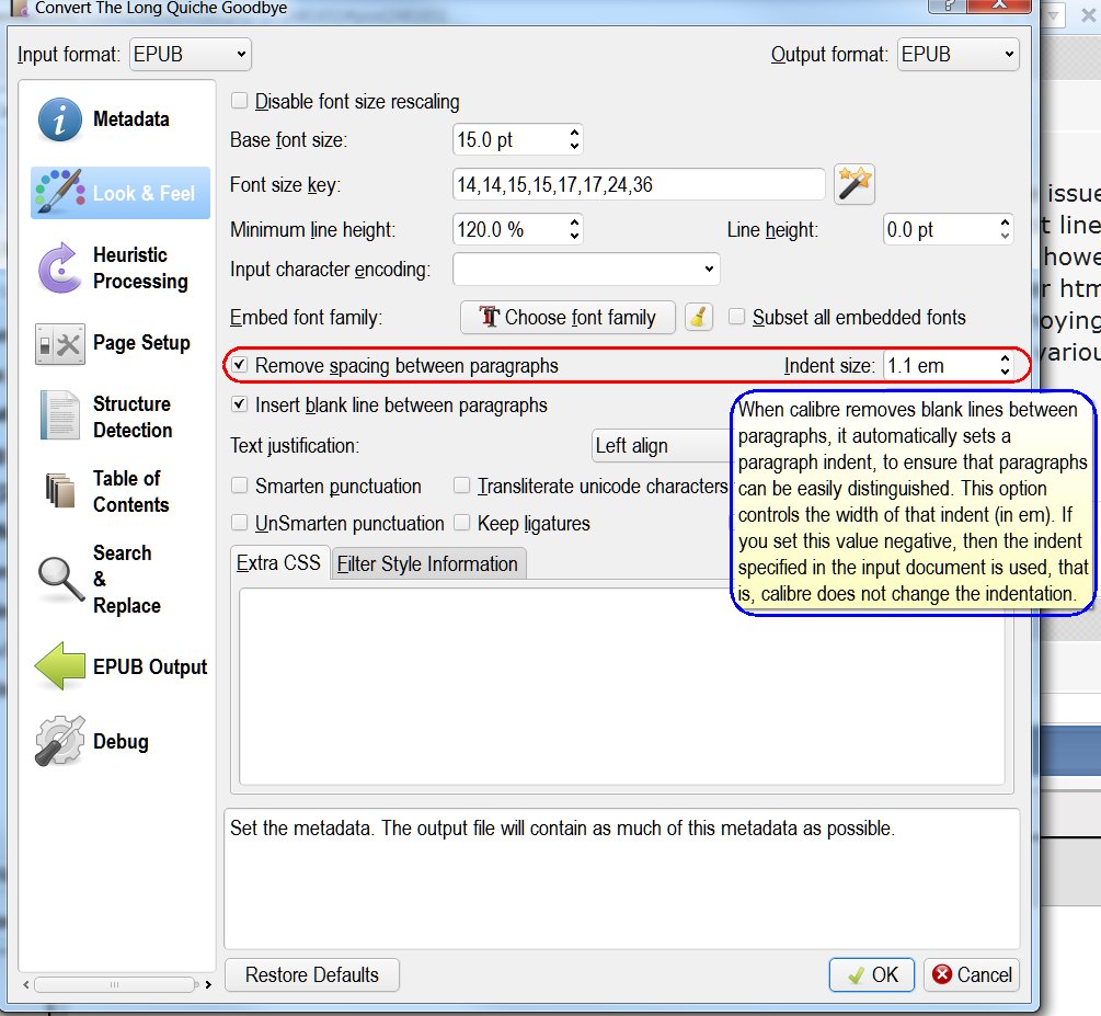 Please help! I have spent hours trawling through threads trying to solve a simple issue. I make my ePub files using Word, via Atlantis. For the first paragraph of each chapter I set the paragraphing of the first line to 0 (following normal conventions), while the rest of the book is 0.5. When I convert the ePub to Mobi using Calibre, however, Calibre forces all paragraphs to indent. But I need those first lines at 0. How can I stop this? I don't wish to enter html code etc. I simply want to tell Calibe to leave all the paragraph first line indents the way they are. Apart from this annoying issue I am very happy with the resulting mobi file and do not wish to create a mobi file in any other way due to various reasons. Thanks all! Karen |