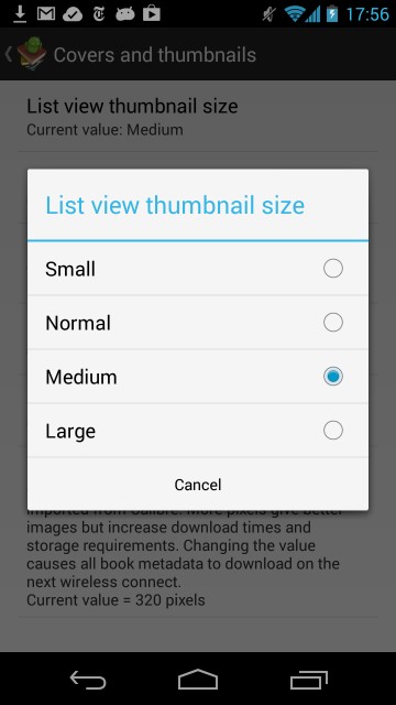 I don't know if this is new, but I just tried to connect to the content server and it failed - no books showed up and I hit disconnect. The content server problem was me and is now ok. The problem is that when I tapped disconnect and the screen went back to the book list, all covers are gone and title and author are all caps. I went to book details and back hoping that would refresh the display, but it didn't. I exited and when I went back in immediately the covers and regular text were still missing. I exited again and when I went back in after a minute everything finally looked ok again. Here's a screenprint: