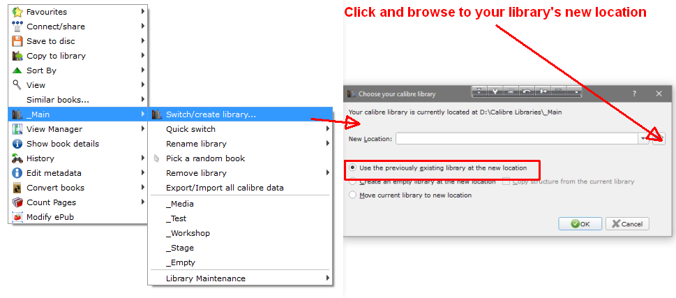 First post. Windows 7 Prof 32bit PC I thought I'd move my Calibre Library folder to another folder. Have Calibre Library as a sub-folder. Bad move I've discovered. I found a post where I should have used Switch/Create Library but too late. Now I can not get my Calibre Library back. All the info is still on my hard drive, in a couple of different places but I can't seem to be able to recreate my library. When I open Calibre there are no books there. When I try to move the library I get an error msg telling me that my library doesn't exist. Not sure what I can do. Any help please? And my fault for thinking I could just move the folder to another folder. Thanks Barb |