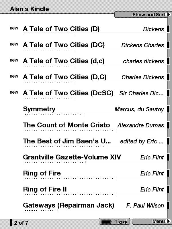 Does anybody have any info on how the Kindle sorts the author field? It seems to be pretty random on mine. Sometimes it seems to use the first name, sometimes the second and once in a while the middle initial. I thought perhaps it was related to entries made with Lastname, Firstname, but it isn't even consistent with Firstname Lastname. I can't immediately see any rhyme or reason here. The titles sort OK.