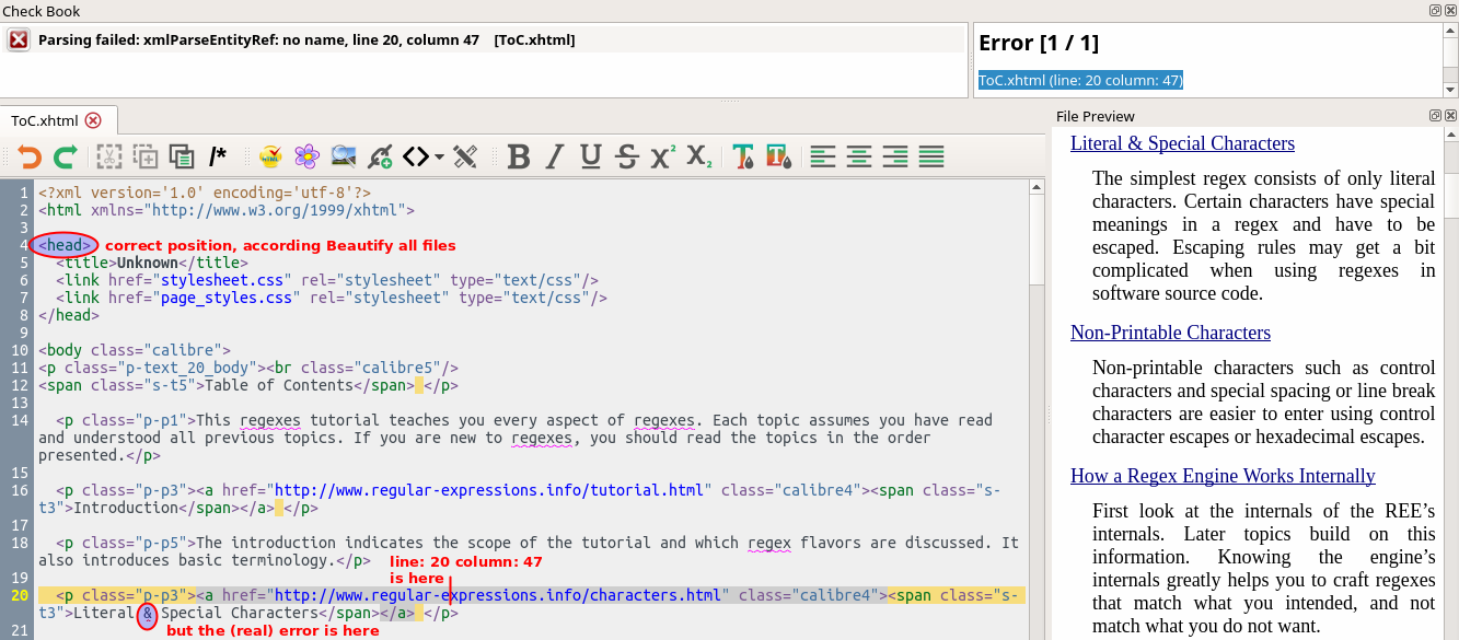 ![]() Reading the book (important with regard to the bookmarks). Run: Beautify all files Edit book: Change of heading Literal Characters and Special Characters to Literal & Special Characters. Click: Save. Check Book: Run check Parsing failed_ToC.xhtml (line: 20 column: 47) The to be corrected error is indeed displayed (~) but not reported correctly. Why is that? Click: Try to correct all fixable errors automatically Error corrected [&] - but now the bookmarks file info appears. Why not above? META-INF_calibre_bookmarks.txt Beautify all files status should not be changed by fixing an error. Last edited by chaot; 05-18-2016 at 09:45 AM. |
