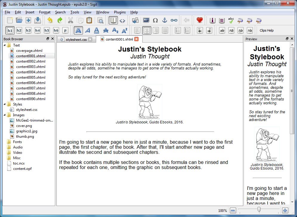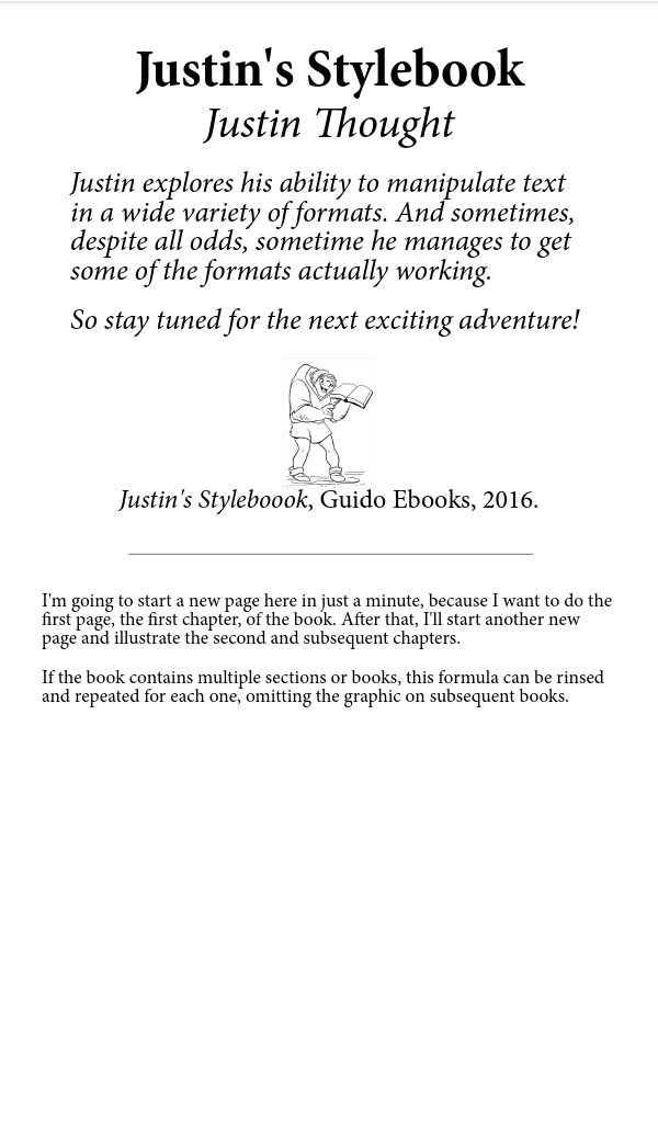 I have a fairly extensive collection of e-books from various authors, and I have always thought that it would be logical that each of the books from each author would look best if they displayed consistently. Now, whether you're finding your e-books from an online resource for little or no cost; or buying them from the big publishing houses, you're likely to get a devil's-brew of formatting, ranging from the elegant to what I call "word soup" with no formatting or chapter breaks at all. Therefore, I undertook the process of trying to reformat some of my more favorite ones into a consistent format. Now, my pick-up app for reading is Moon+ Reader because I like the formatting options it offers. I also often make notes within the book, and Moon+ offers this feature. The app also provides reading stats, and keeps track of those books that have already bitten the dust. Now, I noticed that much of my careful formatting was lost in Moon+, and I began to be curious about what the display would look like on other e-reader apps. So I went to the Play Store, and I loaded another e-reader that I had seen recommended in this forum; then loaded several more by using the scientific selection process of choosing the first one at the bottom of the Play Store screen labeled "People who loaded this also loaded..." Then, I slapped the ebook that I created to hold the formats that I use regularly in my upgrading process onto my venerable Samsung tablet, and started comparing the results. I was aghast! I discovered that there was absolutely no consistency across software platforms whatsoever. One e-reader would give fairly good results on one of my favorite formats; and look horrible when displaying another. Then I began to be curious about how these favorite formats would look on some of the dedicated e-readers discussed in this forum. I realized that to find the answer to that question, I would have to invest in a couple-hundred different e-readers. I tapped my rich uncle for the funds to do this, but he is mouldering away in a debtors prison in Argentina, and wasn't able to help me, and I don't have the skills (or desire) to create a go-fund-me site to finance this project. (I'd probably use the money to spend a couple of weeks--or months--or the rest of my life--in idyllic bliss in some out-of-the-way spot like Cancun if it were successful anyway.) Instead, along with posting screenshots of the results of my research so far, I'm also making my format book available to you, whom I assume already have one of those aforementioned dedicated e-readers. I'd love it if you could take screenshots of the format that you get and post them here. Maybe from this, others could be guided in their choice of their next e-reader. One thing I have concluded from this little project (hobbies and other time-wasters sound SO much more important and meaningful if you call them "projects") is that there needs to be an establishment of some kind of standards for e-readers, just as the electronics industry managed to develop a standard for video recorders way back in the '80s; just to prevent us from having to choke down the occasional dinner of word soup. Anybody want to post their results? Now, if I can get this forum to cooperate with me, I'm going to post the screenshots for the various readers for each of the more important formats I have developed, below. They are, in order, a screenshot of how it looks in Sigil; next a screenshot of the presentation within Calibre on my computer. Not surprisingly, those are pretty much the way I wanted the pages to look. Following that, in order, are the results for Aldiko Reader, Cool Reader, FBReader, Gitden Reader, Lithium, Moon+ Reader, PocketBook, Supreader, and UB Reader. You judge for yourself which of those give the best presentation. This first is a title page I use for all my e-books, with the title, author, a short description, and a thumbnail of the cover. Below the separator, I can add any copyright information, dedications, and epigraphs. If there's any interest in this thread, and if the mods don't come in and torch this post because I did something wrong, I'll come back and post some screenshots of other pages. But at the bottom (I think), there's a link for my stylebook. Give it a shot on your favorite e-reader, and I'd be interested in seeing what it looks like there. |