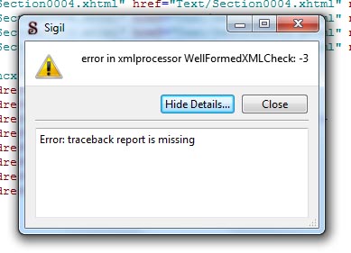 1) When splitting the file, the first new file created, Section001.xhtml, appears correctly in the Book Browser and Content.opf. But as soon as you split this to create Section002, Section001 gets renamed, in my case to "xf64414a3-45dd-46a8-a724-dd073bbdbde8" in the Content.opf. See SigilBug1.jpeg. 2) If one changes the order of the HTML files in the Text folder, the document icon disappears from that file's line in the list. I created a blank file, Section007, and dragged it to the top. The file remains, appears uncorrupted, and appears in the correct spot in the Spine in the Content.opf, just the doc icon has disappeared. See SigilBug2.jpeg. If one then tries to merge any of the split files back, you get a Python error (SS3). You hit Close and get another error (SS4). Then you hit close again and the file merges. Last edited by eggheadbooks1; 11-18-2016 at 01:27 AM. Reason: Forgot to add... |
