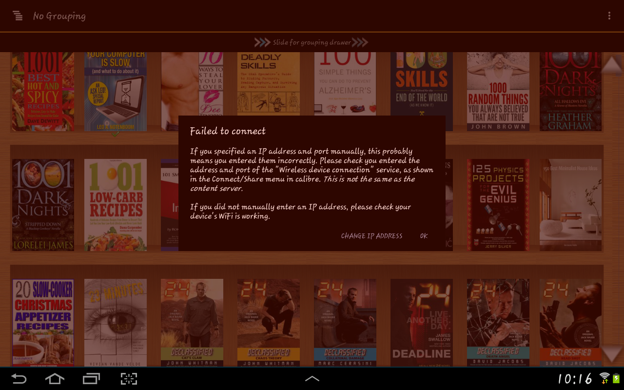 The problem started a few months ago after I replaced my old USB modem. I would usually connect to the internet on my pc, then share to my tablet. I relied on the default connection settings in CC. Now I use 3g wifi dongle, which can accept multiple wifi connections so I don't need to share to my tablet anymore. I can connect to the content server just fine, but when I try to use the wireless connection, CC sees Calibre but doesn't connect. It shows that little message box about wrong IP address. I should mention that for maybe upward of two months now, CC wouldn't even detect Calibre, no matter what I did. I visited my dongle's web page to change it's address. From 192.168.0.101 back to it's original 192.168.0.1. The DHCP IP pool range is from 192.168.0.100 to 192.168.0.200. Normally, with the .101 value, my pc would take .100 and my tablet would take .101 which is the same IP as the router. It meant I couldn't access the internet on both devices simultaneously. I didn't realize this until a few days ago. I'm still not sure if that's the problem. So instead of connecting both devices to the dongle, I decided to connect my pc using a broadband connection then share to my tablet, just like before. [the same dongle]. When I did this, I had multiple ip addresses, non of which CC accepted. It didn't even detect Calibre most of the time. Sometimes, I'd change something, then it would but wouldn't connect. I've tried everything I can think of. I read CC's FAQs multiple times. I completely turned off my firewall, I don't use an antivirus. I've tried fixed ports and IP addresses. I'd really appreciate some help with this. I've relied on the content server to send books to my tablet these past months. But I've been unable to sync between both devices which is really what I need. Here are some screenshots: 1. The usual error message. 2. Calibre recognizes my tablet when I connect via USB. 3. CC finds calibre but non of these two puts me through to calibre. I should add that before I began having this problem either of these could connect CC to Calibre. Sometimes either one or the other. 4. The second option connects me to the content server. 5. Results of debugging device detection: 6. Sometimes content server and wireless connection have different addresses, which I read on CC's FAQ page is normal. I make sure the ports are different. 7. I know it won't work but I tried to use the content server's port for the wireless connection. I get this screen, which is what I'm supposed to see if the CC successfully connects via the wireless connection. But of course, this is next: CC's log file is attached. calibre.companion.debug.log (1).txt |