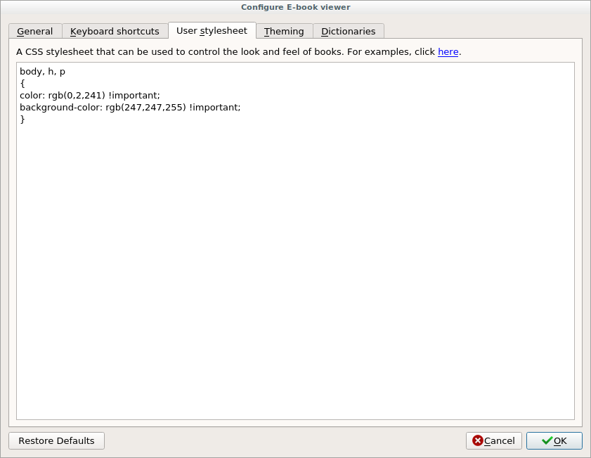 I'm trying to get dark blue text throughout an ebook I'm reading, using Calibre Reader. Using a CSS stylesheet, via settings.