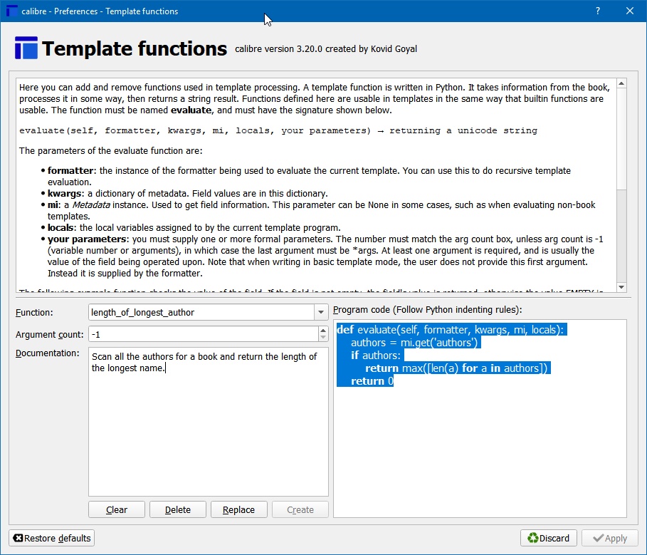 I have set a custom column Author Length (#AL). this column populate with a numeric value, corresponding to the length of fields Authors. #AL as I have it is not very useful. Is there a way to make #AL show not the length of the field Authors, but instead, the length of the lengthiest author of field Authors? Example: Authors = A. Star & Jessica Nicholls & Dariel Raye & Mia Darien & Abigail Owen & B. R. Kingsolver #AL = 87 What I want to have: #AL = 16 (Jessica Nicholls and B. R. Kingsolver are both 16 characters long, while A. Star is 7, Dariel Raye is 11, Mia Darien is 10 and Abigail Owen is 12 Why do I want this? So that a book with Authors "A. Star Jessica Nicholls Dariel Raye Mia Darien Abigail Owen B. R. Kingsolver" will show #AL = 77 and by that high value I can easily correct the Authors field. Thank you very much in advance for your time and your help. |