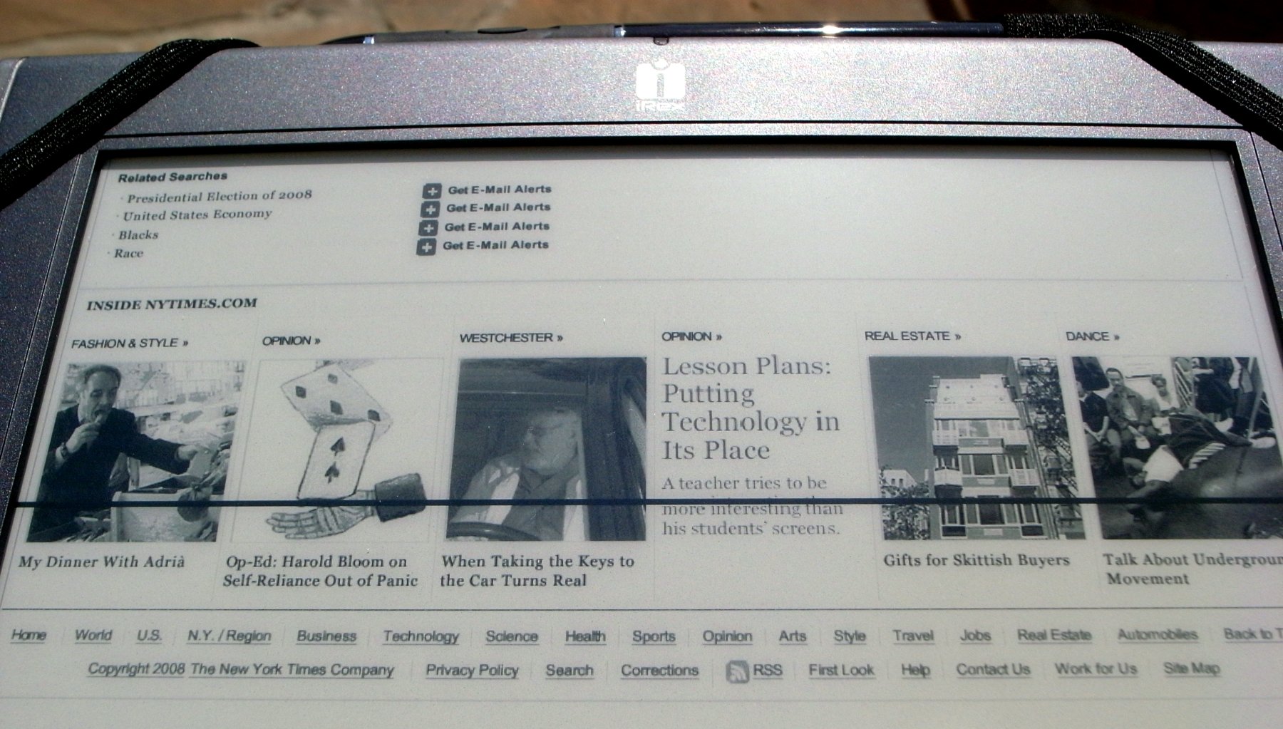 https://addons.mozilla.org/en-US/firefox/addon/636 It converts any page to a PDF, and since it's an online service via a FireFox plugin, it works as well on Mac OS X, Windows and your favourite flavor of Linux. Once transferred to the reader, the result works very well using the combo of FullScreen & PageFlow mode! I'm consistently impressed how well PDFs work on this thing, even though it's still my least favourite format. The same file on my Sony reader: I'd have to be pretty desperate to read it like that. Below a couple of shots, taken in the brightest morning sun. Try that with an LCD screen! The second one shows PageFlow in action: that black line is where otherwise an unfortunate pagebreak would be.