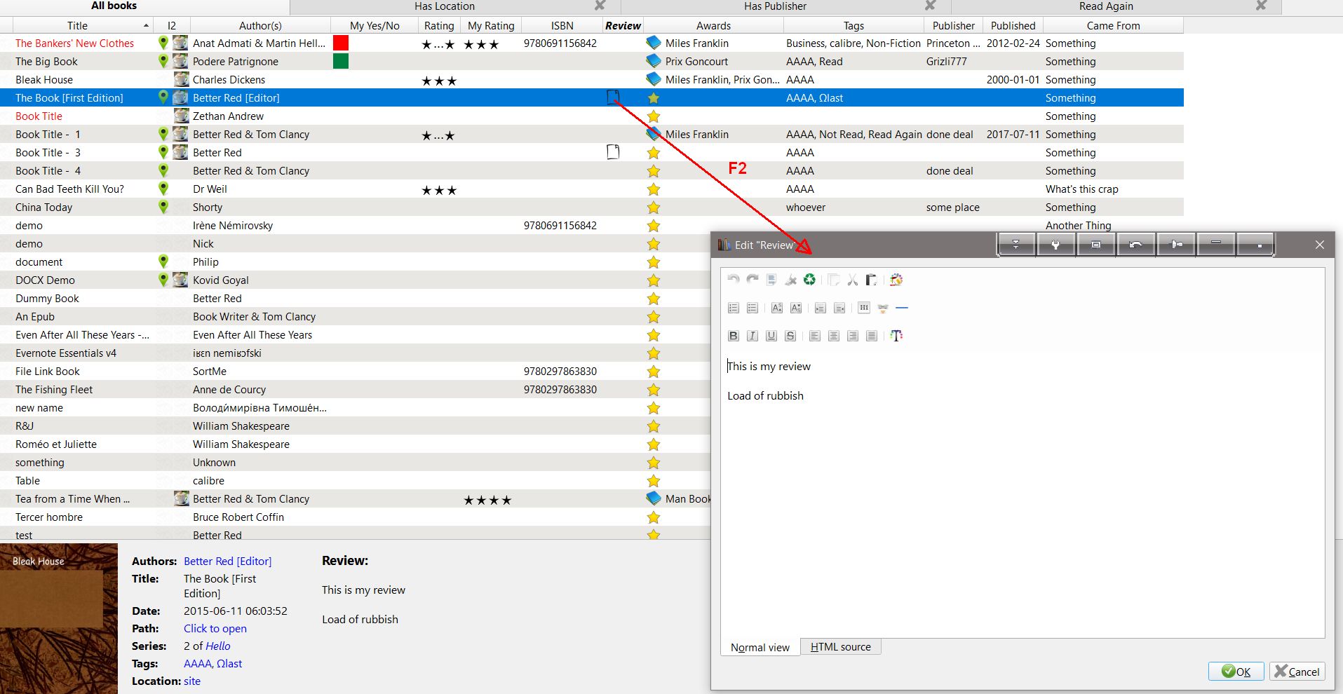 Suggestion, instead of appending your review to the Comments column, where it could get overwritten by a subsequent metadata download, add a custom column. Show it as an icon in Book List You can edit it in the Book List by tabbing to the icon and pressing F2 You'll probably want to check the Review column in the Look and Feel->Book Details tab, I would position it immediately before Comments. BR |