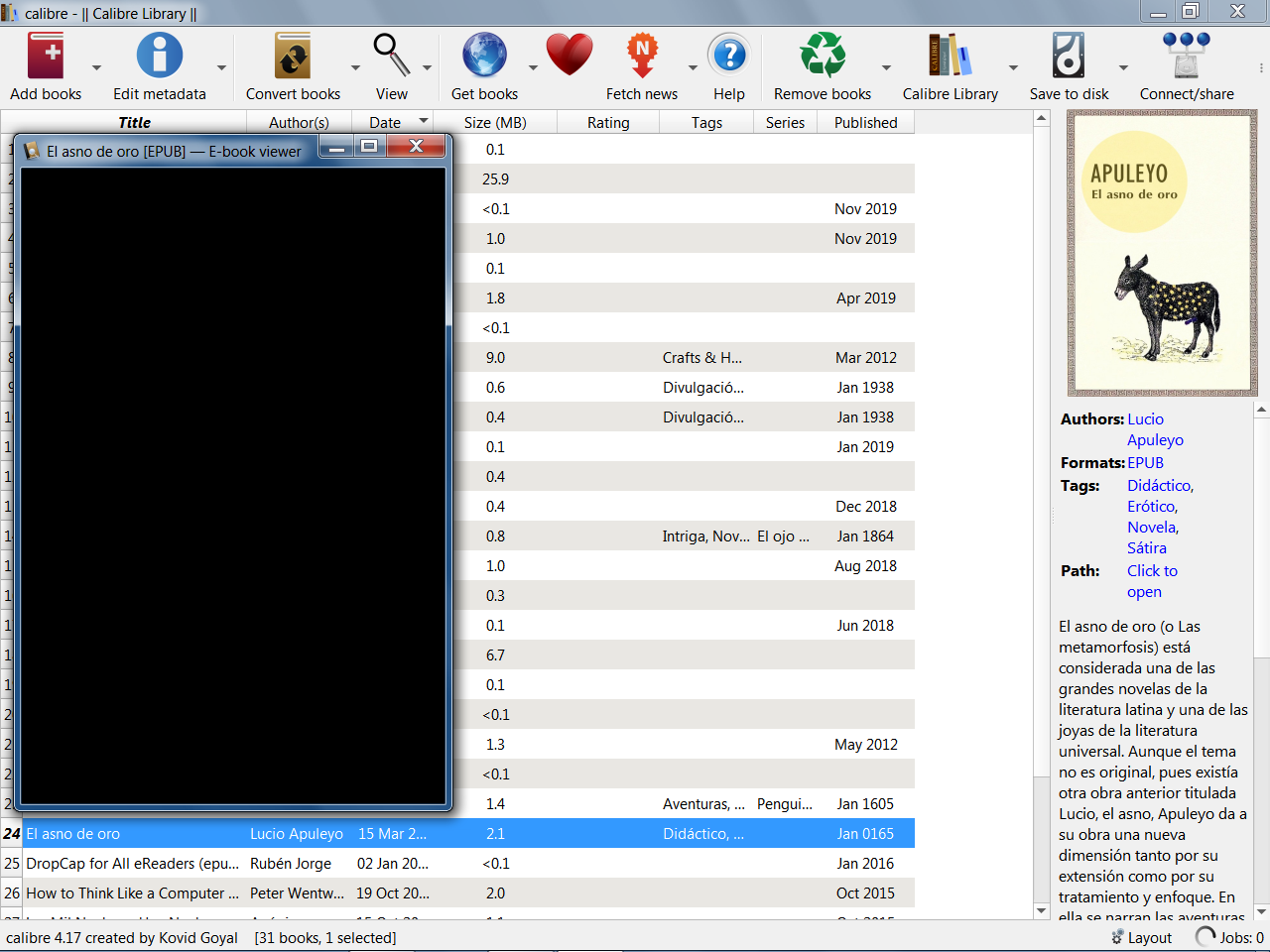 QTWEBENGINE_CHROMIUM_FLAGS="--disable-gpu" calibre-viewer seems not to have any effect. The curious thing is that when the Viewer is able to display an epub correctly, then all epubs can be displayed, even those ones that wasn't able to at a first moment. I don't know why some epubs are showed without issues and others didn't. |