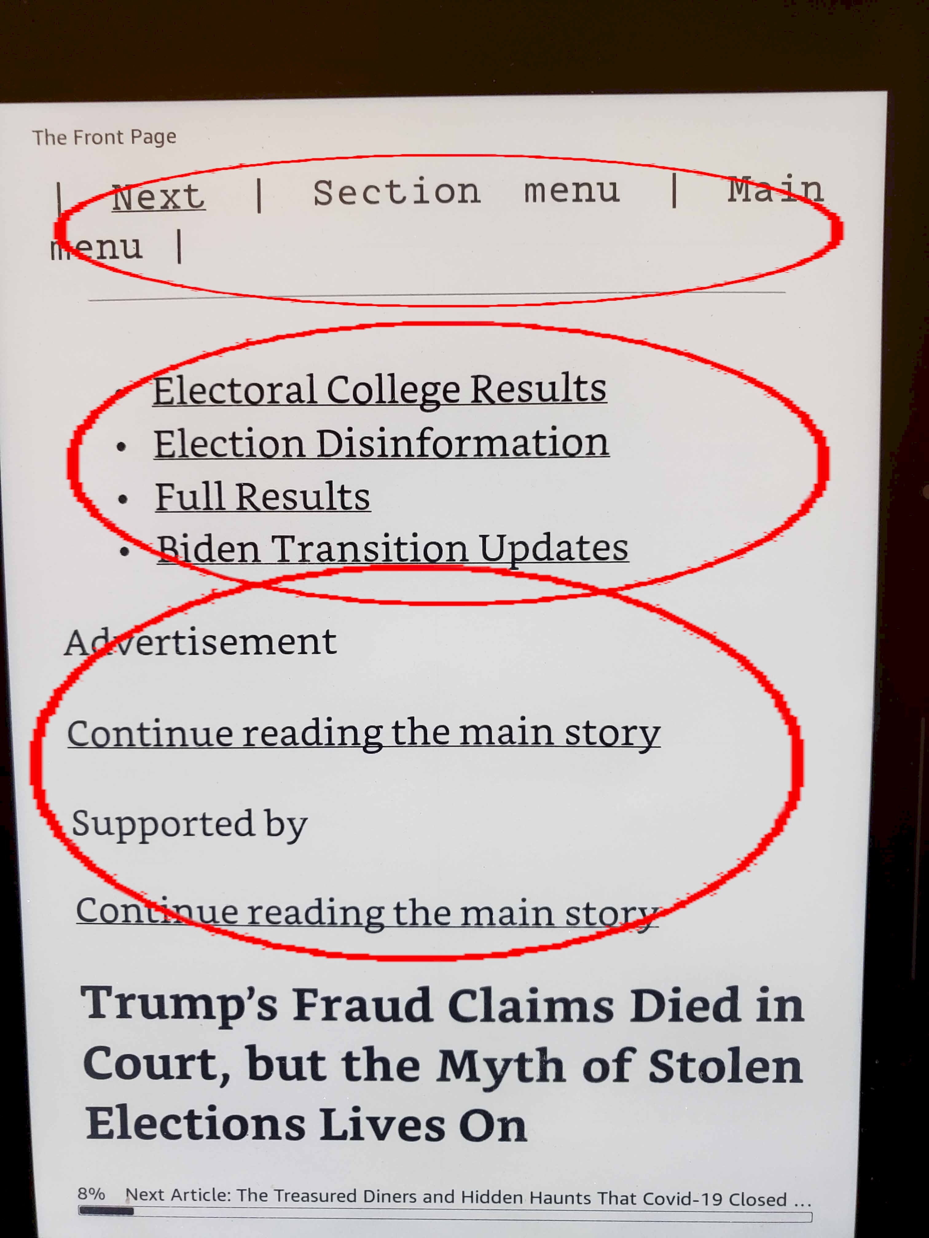 Thank you for taking the time to reply. Your suggestion to use the web edition of the NYT worked to allow me to remove sections from the recipe that I did not want to load onto my devise. Unfortunately, when I updated Calibre from 4.23 to 5.8.1, I still got all of the extraneous information I previously complained about. I am trying again to upload pictures but I did not have much success the last time. I hope you can assist me further.