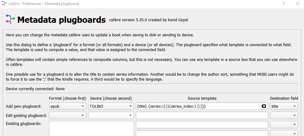 Alternatively, abandon the catalog and use a plugboard (Preferences / Plugboards) to put the series into the title when you send the book to the Tolino. Something like this Code: