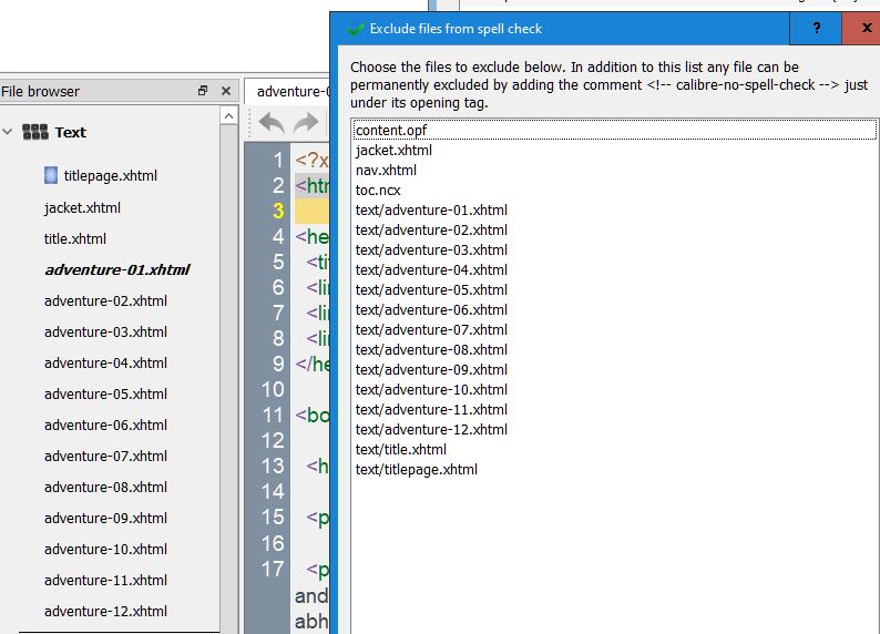 1. I added a Snippet to insert the <!-- calibre-no-spell-check --> with trigger = "nsc" I only get "ns<<!-- -->. Am I putting the snippet in wrong? 2. Not to sound ungrateful or picky, but would it be better to display the Exclude Files in book order, instead of alphabetically?? |