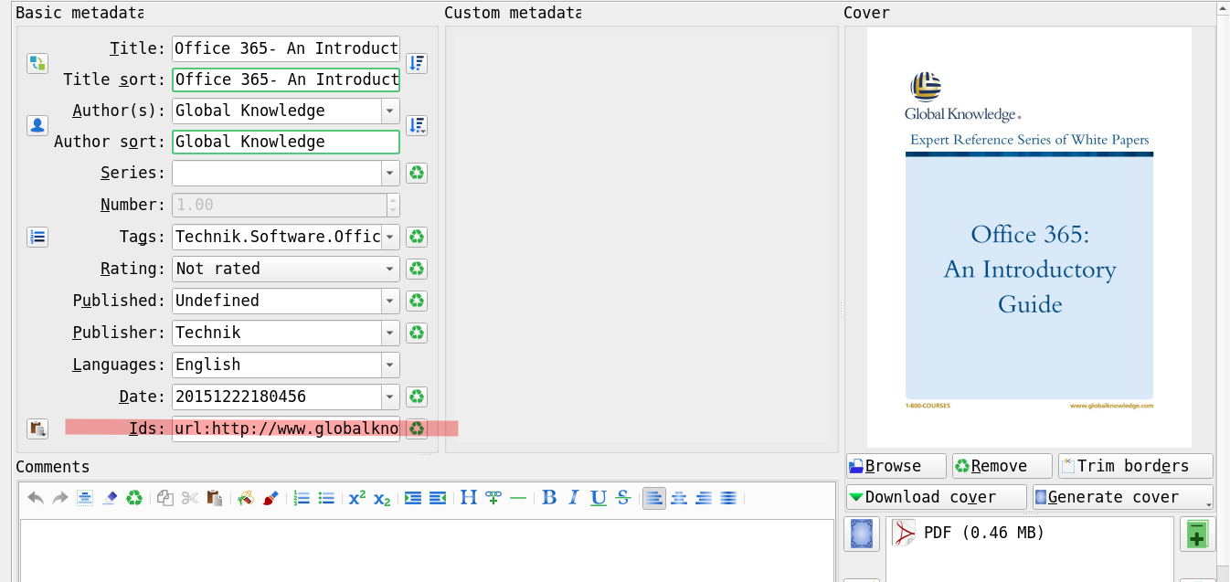 um deine Quelle zu verlinken kannst du das Feld Ids benutzen. Hier ein Beispiel (ich habe eine englische Calibre-Version): 1. Metadaten bearbeiten und dann unter ID z, B. als Identifier url eingeben und anschließend die Adresse. url:<https://www.Adresse.com> Beispiel: 2. In der Übersicht der Bücher kann man dann auf die ID draufklicken. |