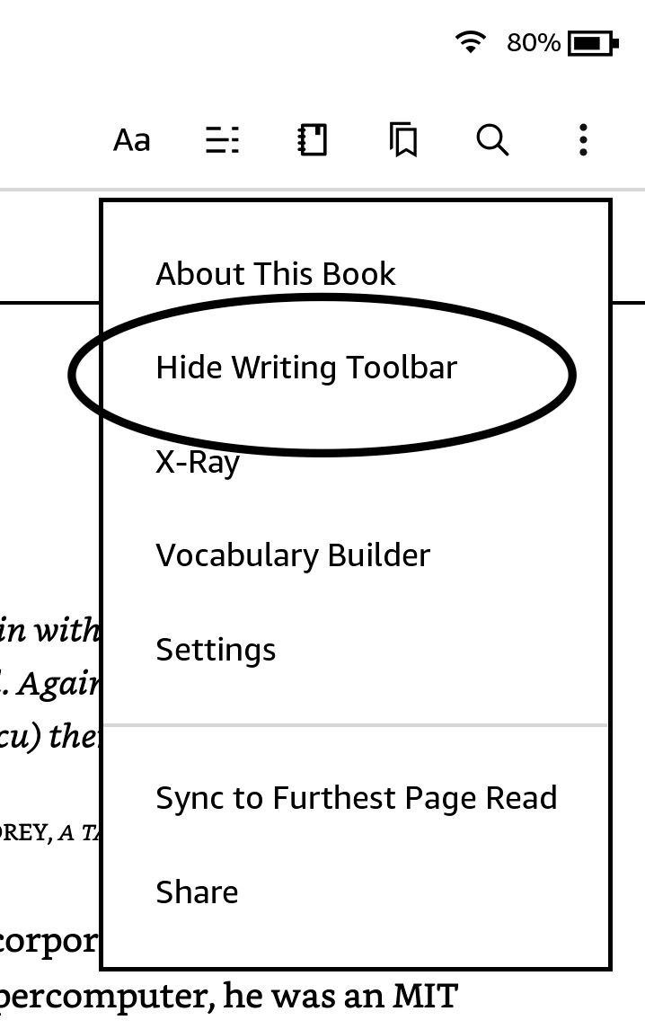 It’s annoying having to hide the writing toolbar whenever I read a book. I think it should default to hidden when reading a book. Considering when you go to make a note in a book it asks you to select either typing or writing, what's the point in having the toolbar there in any case? It is a blot on the landscape, like having a large squashed fly in the margin of your book. Impossible to ignore.