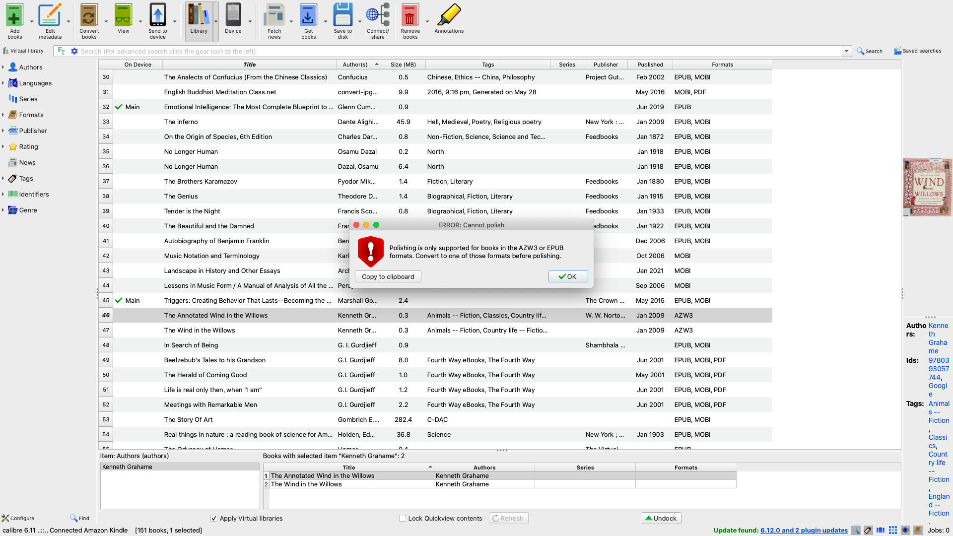 1) Can someone please explain the concept of Polish? How is metadata used to generate more metadata in a way that is different from searching for metadata (and generating it from) online? Also, I continue to get an error message when trying to use the Polish command with Epub and AZW3 ebooks.