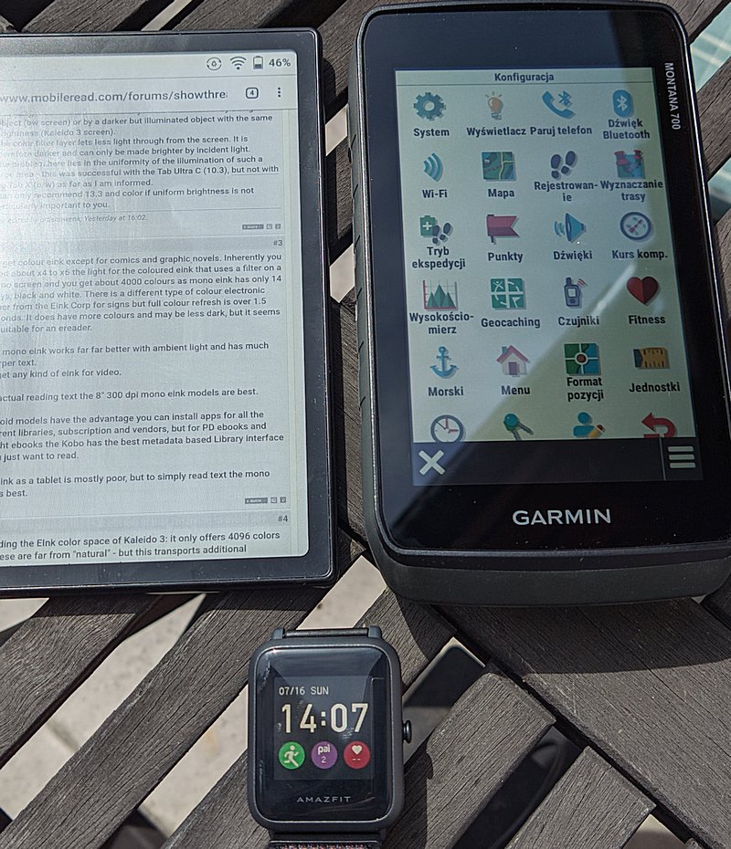 Just some comparison, e-ink, transflective LCD from Garmin and MIP screen on a watch. All on sunny day without backlight. I can't understand using OLED on watches. And I'd like to get a phone with a screen like Garmin GPS.