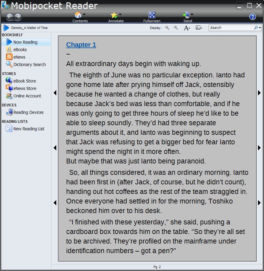 For a "text" PDF your best bet is to convert it to MOBI before transfering it to the iLiad. Windows MobiPocket Reader can import PDFs and produce a MOBI. The transfer isn't perfect (e.g. no TOC and one sentence paragraphs not detected), and if you have a HTML or RTF (e.g. from MW Word) version that will likely transfer better. The attachment is from Windows MobiPocket Reader, but the iLiad MOBI reader would be similar. |
