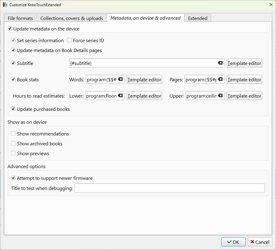 Using KoboTouchExtended I assume "tasg" should be "tags", but where do I fix this? When I go to Metadata plugboards, everything is empty Subtitles for transferred epubs show the error on the Kobo |