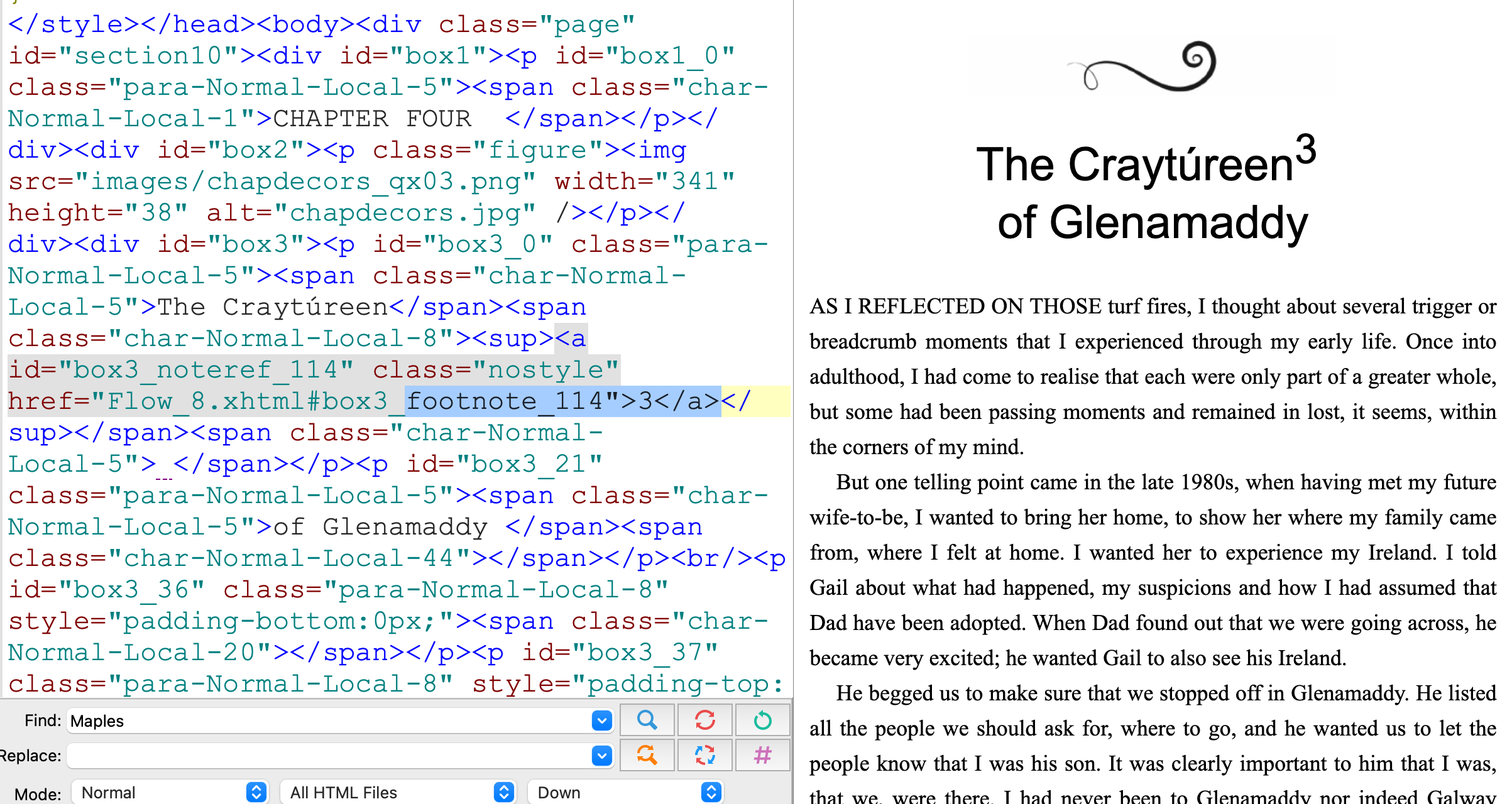 thanks David as per screenshot: <p id="box3_0" class="para-Normal-Local-5"><span class="char-Normal-Local-5">The Craytúreen</span><span class="char-Normal-Local-8"><sup><a id="box3_noteref_114" class="nostyle" href="Flow_8.xhtml#box3_footnote_114">3</a></sup></span><span class="char-Normal-Local-5">*</span></p><p id="box3_21" class="para-Normal-Local-5"><span class="char-Normal-Local-5">of Glenamaddy </span><span class="char-Normal-Local-44"></span></p> |