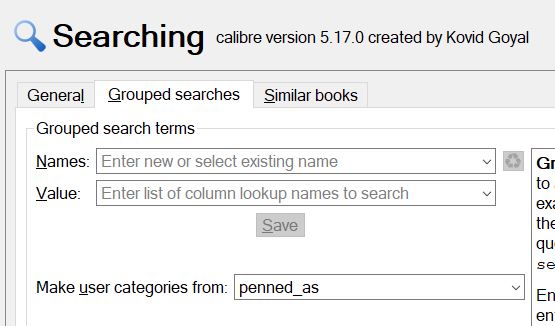 Been a while since I set this up. I have a custom column #psudo4 (first image) Originally this was just for pen names, but like all things it filled others (later) But this is where I put the Real name if the cover has a pen name As for searching you just need to set Preferences Similar and Grouped searches up. FWIW Penned_As now appears in the Tag browser, so you could drive your search from there OK it is later Other uses:I limit my {Author} up to 3 names , Part of the reason was File based devices could not deal with the huge path (or it got munged up so weird) Collections: {Author} gets the Primary or EDITORS, all the others get into #pseudo4 . FWIW I do something similar with series, but I use <various> IN {SERIES} if there is more than 2 (I am of the school, to avoid many extra columns if only used rarely) |