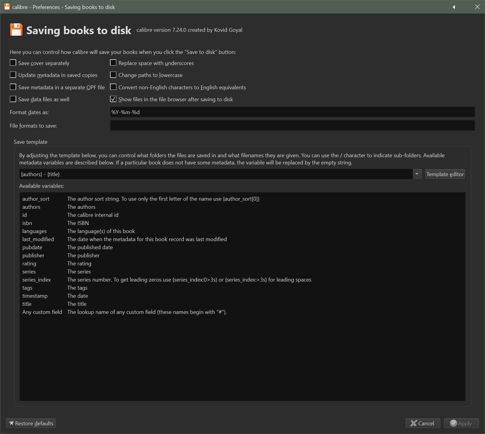 I just want the ebook file as such, nothing else. For this, I choose the option Save to Disk > Save only EPUB format to disk in a single folder. What happens is, however, that the corresponding files (jpg and opf) are also transferred to my folder. On top of this, the author and the title are swapped. Author has become title and vice versa! Although the order is still correct in the Calibre menu, it no longer is after having sent the file to my ebook folder. Very odd, and I did not have these two problems on my old computer. Is this a known issue (I could not find anything) and is there a remedy? Many thanks! |
