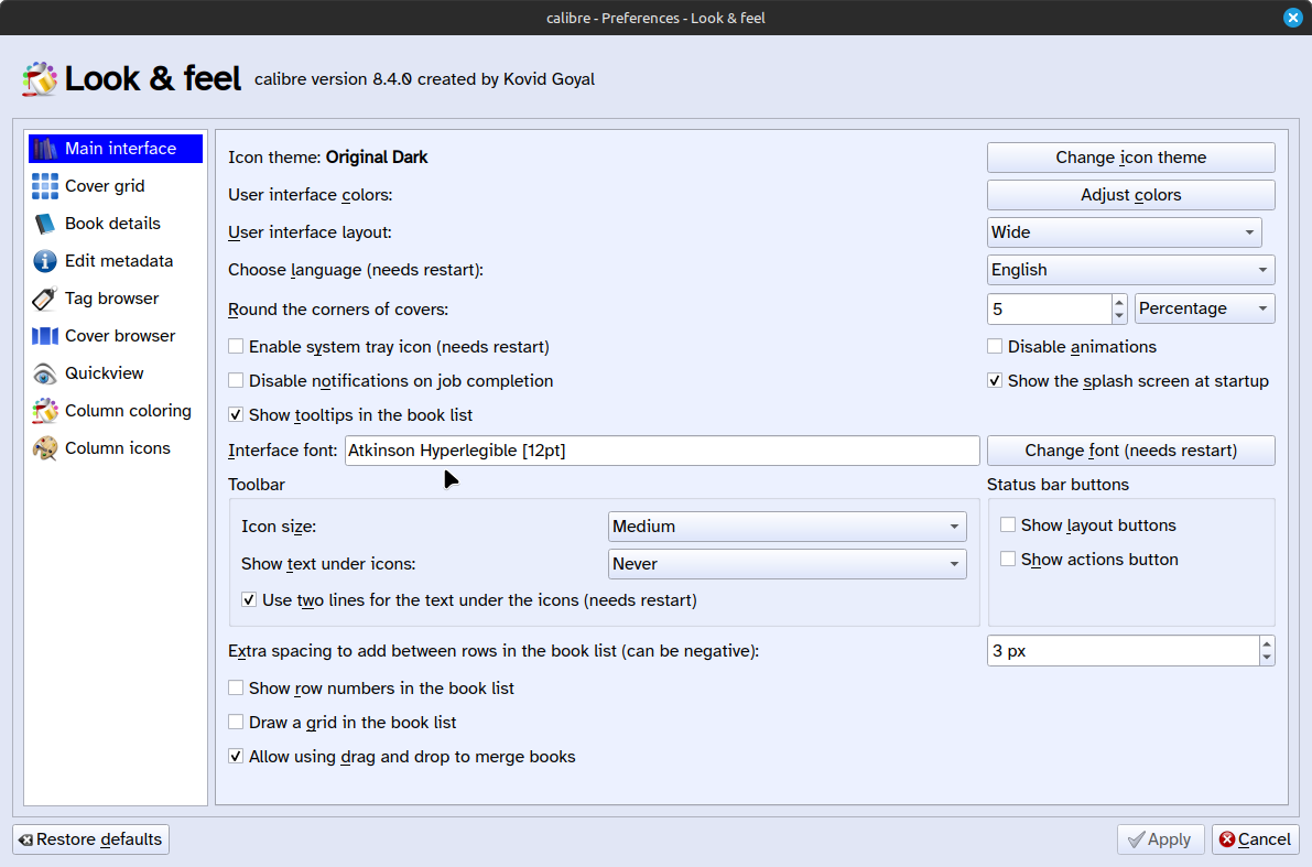 My wife has normal vision and it’s an issue for her too. My low vision is not severe. In fact, all I need is a bit bigger font size, a clear font and a high contrast color scheme. To change to color scheme is not easy. Go to Preferences > Interface > Look and Feel > Main Interface (it defaults to that tab) > Adjust Colors Check “Set Custom Colors” (The dark color scheme is next to useless. A high contrast scheme would be a nice third option) I couldn’t change the white scroll bar slider color from white to something dark. From all of default colors that can be changed, I would expect a value of #ffffff. Can anyone please tell me what to change? It it possible? Here are changes I could make: The background color for alternate rows in tables and lists > #d5e0ff (or any light color because the text is black) Interface font suggestion: I use Atkinson Hyperlegible which is free from the Braille Institute. It’s sans serif and is the clearest font I’ve found. I also use the same font on my Kobo and Microsoft Office apps. You can get Atkinson Hyperlegible from the Google Fonts site or from the Braille institute. Thanks for any help with the scroll bar issue. Really, the white on light grey should be changed for all users. Last edited by End User; 05-21-2025 at 01:12 AM. |