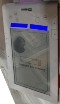 I would suggest the possibility of placing buttons in a way that lets you get a firmer grip. In this (admittedly poor) mockup, I put the buttons at the top across the device. This would let the back of your hand lie under the body of the reader and allow your thumb to rest naturally across the top. Both of the blue buttons would be page advance buttons for left/right reading. The previous page button would be located elsewhere.