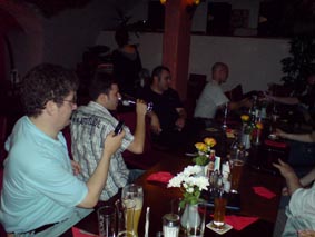 Hallo und guten Abend aus Frankfurt. Wir sind jetzt endlich durch mit Essen. Das wurde nur unwesentlich von Fachgeplauder unterbrochen. Soviel Elektronik an einem Punkt hat's bestimmt in Frankfurt noch nicht gegeben. Zu Essen gab's natürlich auch was. Schöne Grüsse an Alle von Alex, Lunohod, Eagleeye, Drake, Fellball, Netseeker, Mirakix und myself. Wir haben jede Menge Spass hier. Sicher ist hier noch lang noch nicht Schluss.