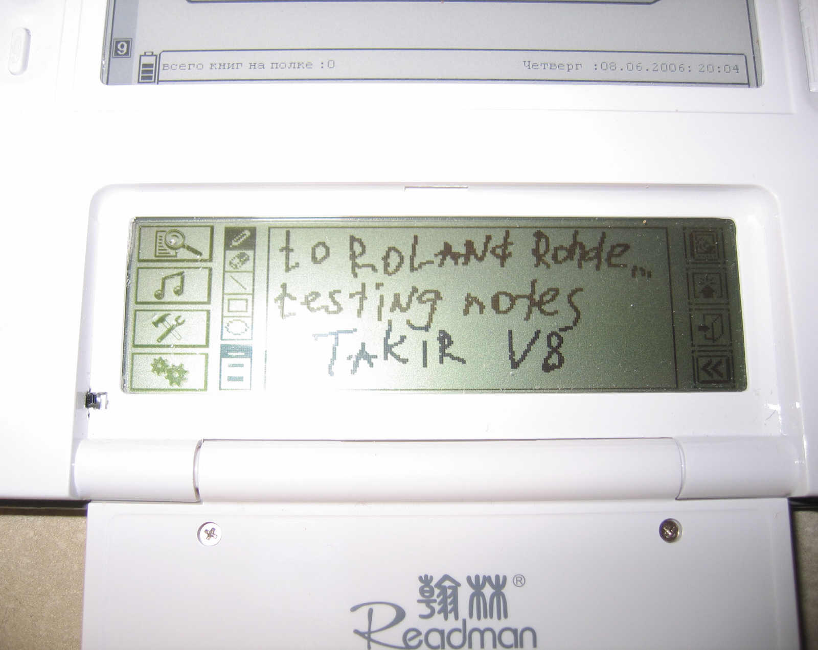 I've been talking to TaKir and LVD about the Hanlin V8 (russian version) and have managed to collect some information. The newest test we did, was to take a HTML file that was "ripped" from a PDF. The PDf file was ok, the HTML looked fine on my screen. Now I asked TaKir to try it on his V8 (please keep in mind that the firmware he's using is still beta). The resulting screenshots are put up next to shots of the very same HTML with the very same limitations/formatting on my PDA (mobipocket reader). For comparison I also put up a screenshot of the file as .txt (ripped from same PDF using PDFtoTXT. The HTML was ripped using PDFtoHTML. As you can see, the performance of both Hanlin and the PDA are far from perfect. Additionally, you can get some impression of how the note-taking works on the Hanlin using the slave-display. This feature actually looks good...^^ Here come the pictures (I hope it works...first time...) www.awde-sign.de/mobileread/V8html.jpg www.awde-sign.de/mobileread/V8html2.jpg www.awde-sign.de/mobileread/html.jpg www.awde-sign.de/mobileread/txt.jpg www.awde-sign.de/mobileread/notes1.jpg www.awde-sign.de/mobileread/notes2.jpg Something that deeply worries me is the amount of "dirt" from previous screen-refreshes that is visible ont he screen of the V8 TaKir owns. I thought new eink screens don't have these "ghost" images, but all the screens i've seen so far contain a lot of these and I find them fairly obtrusive, even seen on photographs. I could imagine really hating them in "real-life". Last edited by CommanderROR; 06-19-2006 at 05:36 PM. |