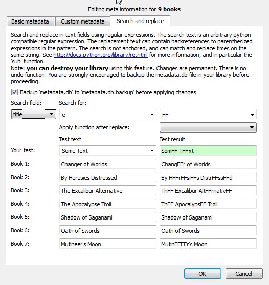 Upon importing large amounts of books in Calibre, I get to a point where I would like to clean titles and authors, examples are: - replace underscores by spaces - remove series information from the title - remove author information from the title I know about the regular expression thing in the import, but that would require to export first and re-import again. More over, it does not help when importing metadata within the ebook itself. Is within calibre anything available to search and replace within titles. |