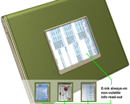 Now this is cool, but why do they have to leave us guys out of the picture? Nice concept, though I don't know if you'll be reading the newspaper on the secondary display. The whole notion of using this type of display; i.e., the secondary display, isn't a new one but the approach by using eInk for low-to-no power usage is definitely cool! I swear I tried to pick up some stock in the eInk distributors, but none are available for public trade... too bad, as it's a hot technology that's not going to just disappear.