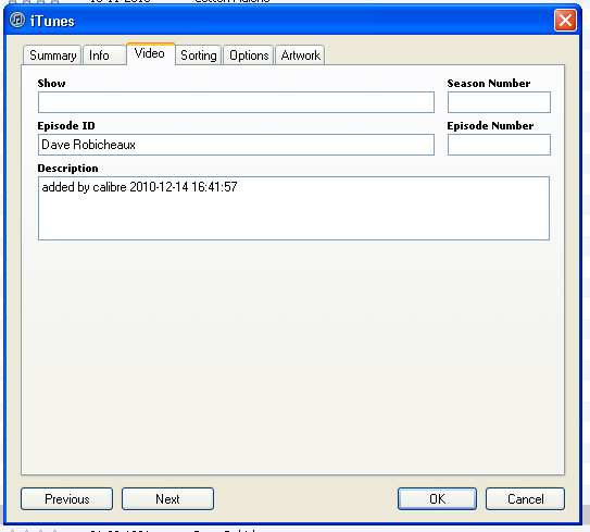 And the results in iTunes. As you can see, the series are sent to Episode ID, but Episode Number is blank. Calibre version 0.7.33 My way of adding books to iTunes is right clicking in the books, and choosing: Send to device -> Send to main memory. Maybe I'm doing this wrong? |