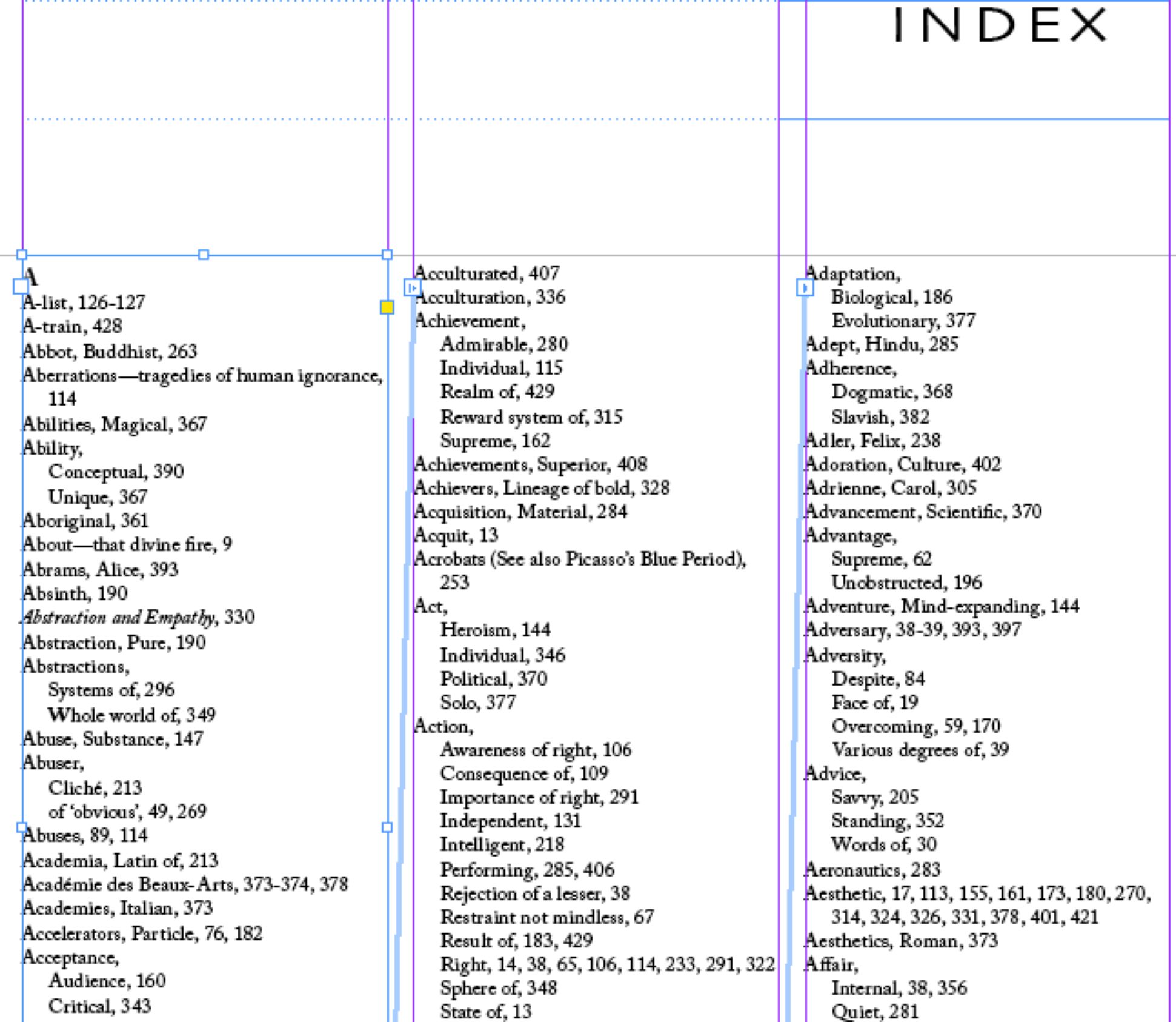But do you really, really, really want multiple columns[*]? Note that in a portable reader the screen width / font size is often such that one column fills the screen already. I would leave the index in a single running column, and maybe add links to the different initial letters to make navigation simpler. [*] If you do, ADE has some extension that could allow them. There was a document where Adobe explained how it works, but it seems to be offline. If you search for xpgt and page templates you could find something. It is not spec-compliant and only works (if it does) with Adobe-based readers. |