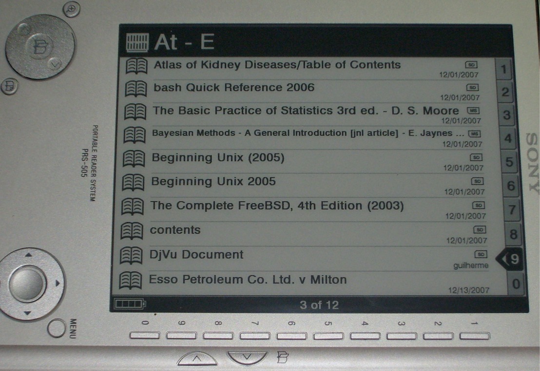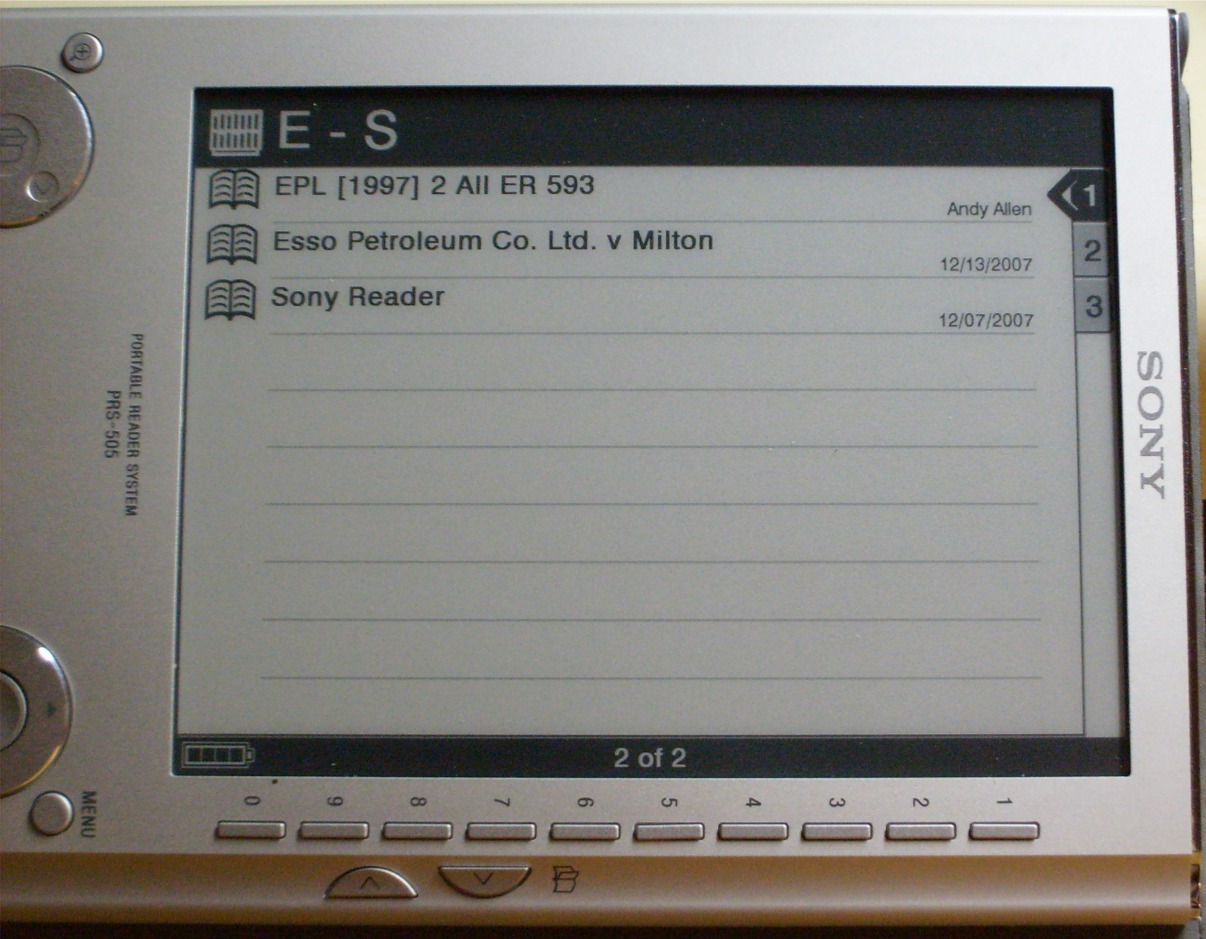 I loaded the files on my PRS-505, and tried them out. First, you need to know the name in the document properties to find the thing on the PRS-505. It does not let you browse by file name, you must select author, title, or date loaded then view them that way. Second, the diagonal measurement on the PRS-505 screen is 6 inches (150mm.) Print these out to scale and see if you want to read them. Third, I view almost everything in landscape mode. The text will be smaller in portrait mode. Fourth, the PRS-505 reads .PDFs natively (but the text is small.) See attached for pics of one of the PDFs. (I didn't try the other one.) Fifth, the PRS-505 does not read .DOC files natively (whatever Sony says) You have to convert them to .RTF using a word processor. See attached for pics of the DOC after it was converted to RTF. Please note that I changed the title of the RTF file to find the dang thing. Sixth, know that you can use a word processor to enlarge or shrink the size of text in and RTF file, but the PRS-505 ignores graphics in RTF files. Andy Last edited by recycledelectron; 12-14-2007 at 12:21 AM. |