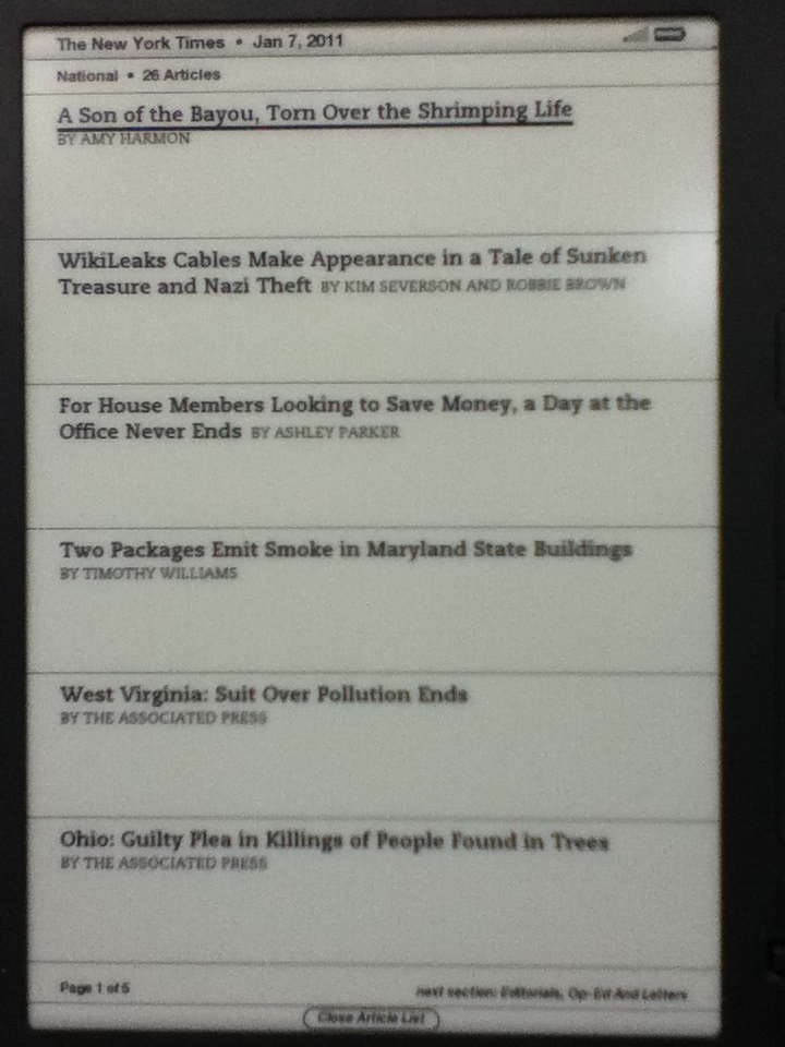 This is my first time posting, but I hope to get more involved, love Calibre and hopefully I can contribute back somehow. A few things, but #1 is the most important. 1) One thing that could substantially improve the Calibre New York Times news subscription is having the article descriptions in the menu. The descriptions are in the menu for the Front Page articles, but not for any other articles (see what I'm talking about in the two pictures of my Kindle). It would be very easy to fill in the description with the first two sentences from the article in the case where the description is blank rather than leave it blank. I spent several hours trying to customize the recipe to use the first two sentences but couldn't figure out how to get a hold of the text body. in the handle_article function these two lines set the description from what I can tell: description = '' pubdate = strftime('%a, %d %b') summary = div.find(True, attrs={'class':'summary'}) if summary: description = self.tag_to_string(summary, use_alt=False) How would we update these lines to parse out the first two lines from the article rather than the blank string? (2) On the topic of the NYT, what is the best time of day to schedule the New York Times for download? I've been doing 6am, but at that time there are only 1 or 2 articles in the Front Page section, at 8am this morning I accidentally downloaded again, and noticed the front page section fill up with 7 articles. Has anyone experimented with this? I am experimenting now, downloading the web version every hour to see about what time the NYT's adds articles to these versions (3) Also on the topic of the NYT for a long time they have been talking about a paywall for web content on the NYT (http://www.nytimes.com/2010/01/21/bu...a/21times.html). Has anyone heard if/when this is going into effect (this month?) and how that will effect the Calibre download? I would love to help with Calibre development, I write in Python for work so it's no problem to learn, just need to learn the ins and outs of how the system works, and what improvements are needed. |