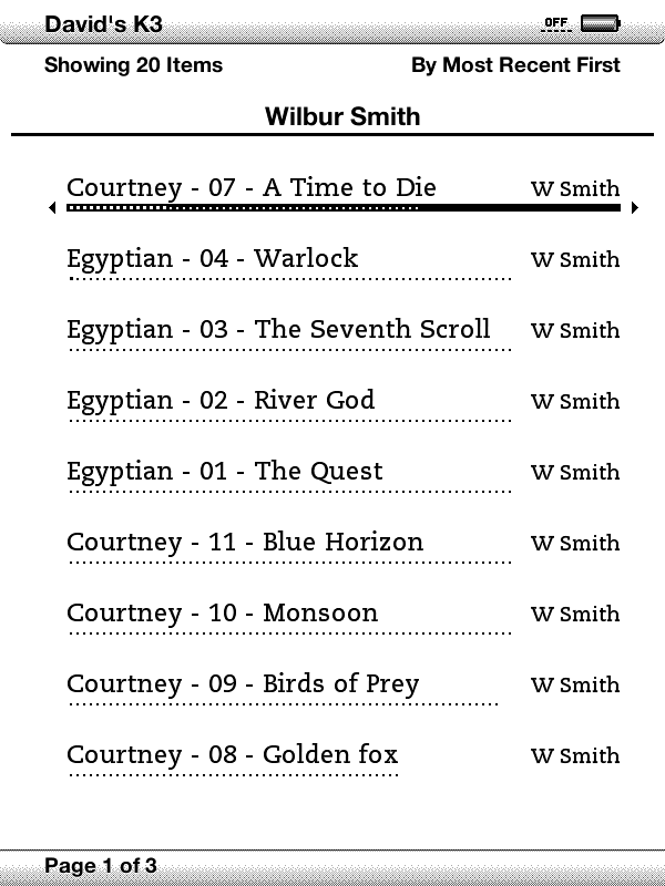 Link here: https://www.mobileread.com/forums/sho...d.php?t=100949 This way my books are labelled with Series Name, #, Title I also entered a 2nd line in the plugboard to shorten the author name to Initial Surname. This freed up how much text I could get on a line. Here is a screen shot of main screen showing my collections This is a look inside the Wiblur Smith Collection This is a look inside the James Lee Bourke Collection Note that as you go down some of the titles are so long they are cut off. Here I have scrolled down within that colelction to highlight one of the lines that was cut off. Note that you get a second smaller line of text with the remaining title details. This is another reason why I shortened the author name. Brewjono. |