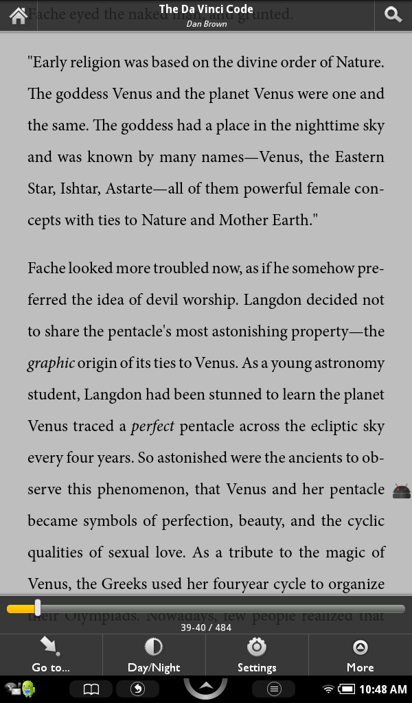 I wish you would have of added a pic of a book open. This may be small thing, but what I like about the stock reader is that it will show me what page I'm on. (page x of xxx) and the status bar is still there giving me the time. I tried an older version of Aldiko and I didn't see these things .......