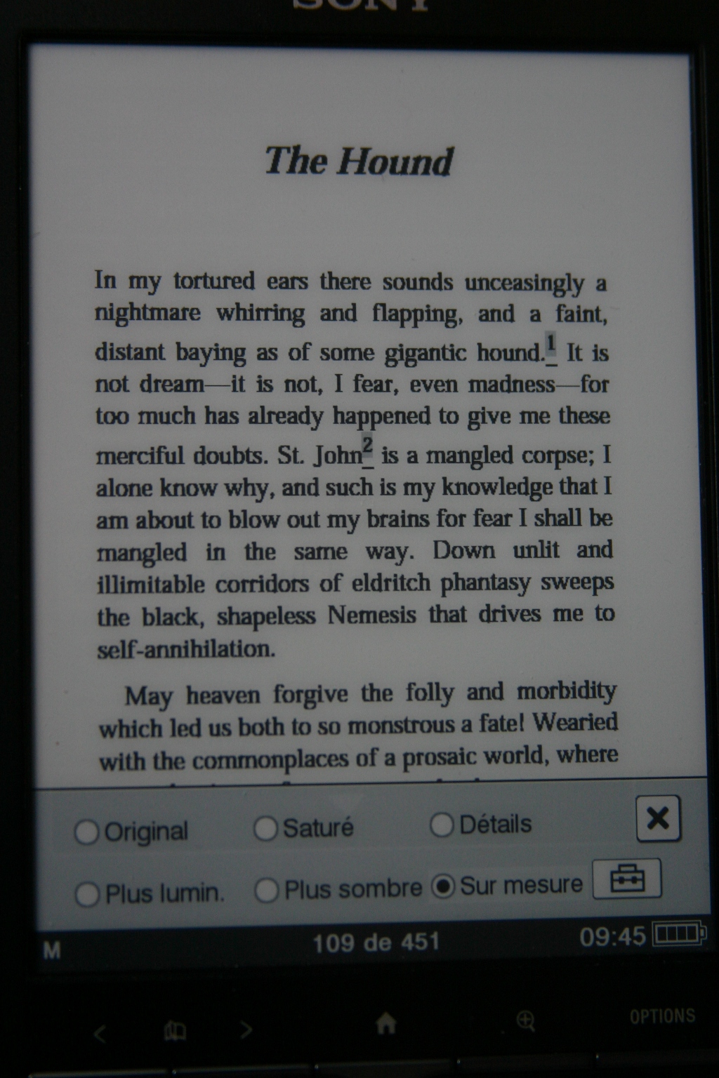 Anyway, it has some weird effect, like when putting the contrast at max. and reducing the brightness, the "background" is still the same white until you reach -127, below that the background become darker. So if you do that (contrast at max and brightness at -127), depending of the font used, you obtain something like a bold font, but a bit messy (see pictures, although I was not at max contrast and brightness when taking the picture -127). It's kind of repelling because it's too bold, but at the same time the text is darker and the small irregularities makes it look like a bad printed book (ok that didn't sounded positive, but the idea is the irregularities adds a bit of "organic" to it). I don't know which one I prefer at the long term, maybe I should try to replace the font used in the book (my 650 is "russified", but this book is borrowed from a library, and I guess it uses it's own (embedded ?) font). Anyone think replacing the font by a bolder one can achieve the same result ? Like the font used in the Kindle, it always seems to me (on photos, never saw a Kindle 3 in real life) that it has better contrast, but then maybe the readability is not that great. |