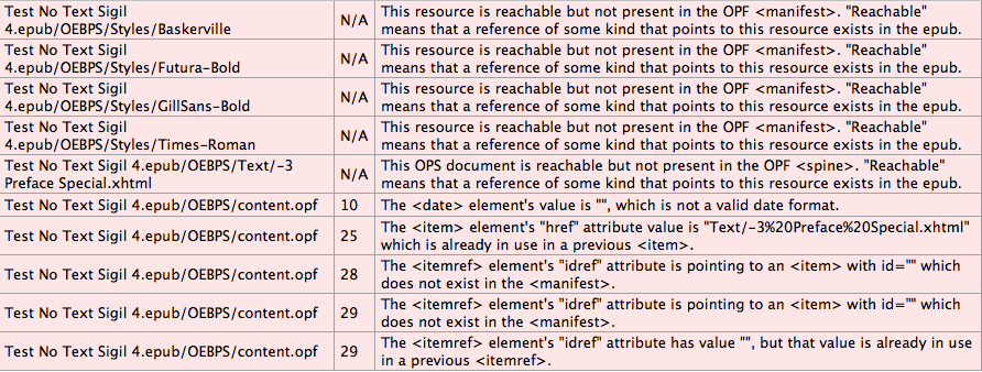 If I edit the file in Sigil 3.4, it validates, but tells me that the file refers to some fonts that it doesn't embed. That's expected. I get the same message before and after adding a cover. But with 4.0RC I get some new messages. I've attached a screenshot. Hopefully that'll come through. The first five errors appear with both versions. The last four only appear with version 4. Thanks, Steve |